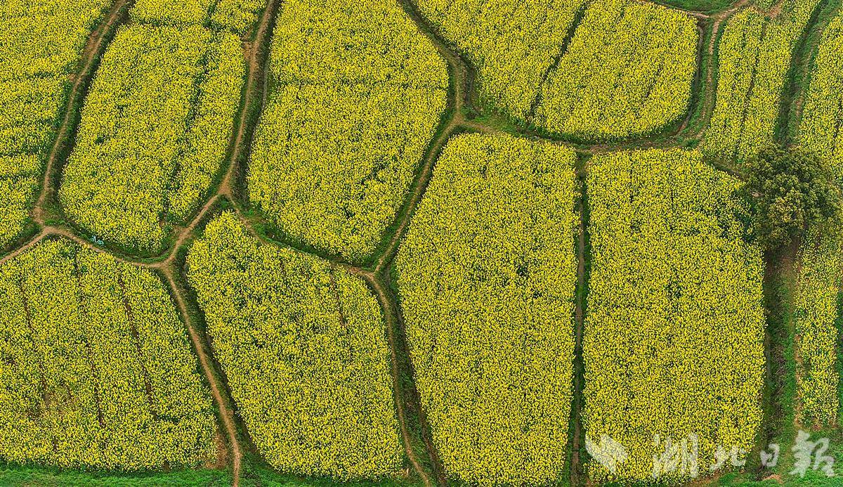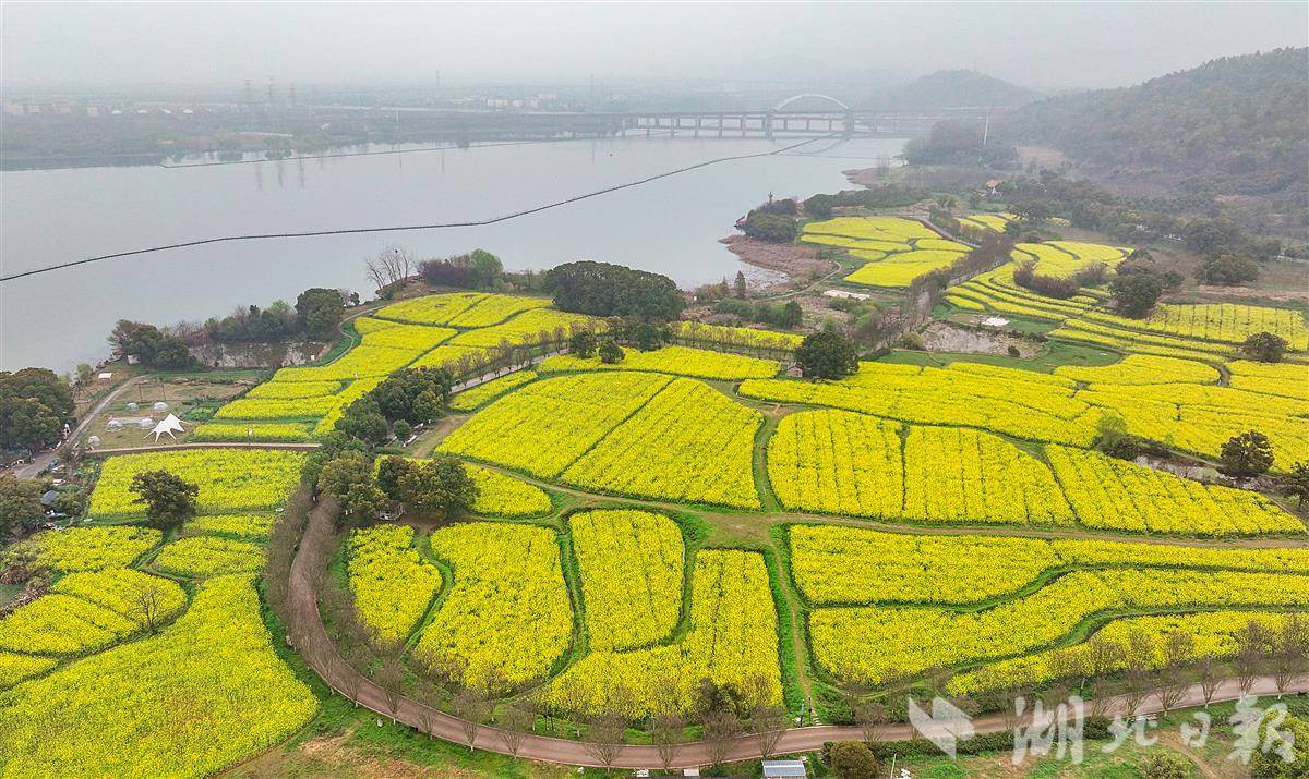 3月23日,鸟瞰位于武汉东湖畔的马鞍山森林公园太渔桥景点,一片连绵500余亩的油菜花田在春日悄然绽放。