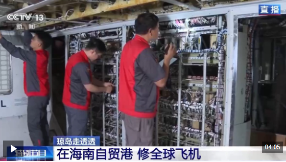 总台记者 范珊珊:在一架来自韩国的飞机上,技术人员正围着电子架以及机舱内部线路进行作业。他们正在进行的是整机座椅USB电源插座接口加装定制改装。这项改装和乘机旅客的需求息息相关,加装之后,旅客可以直接连接座椅上的USB插口连接电子设备。这项改装业务在国际航空维修业内尚属首次,这是海南飞机维修产业迈向高端化、定制化的过程。
