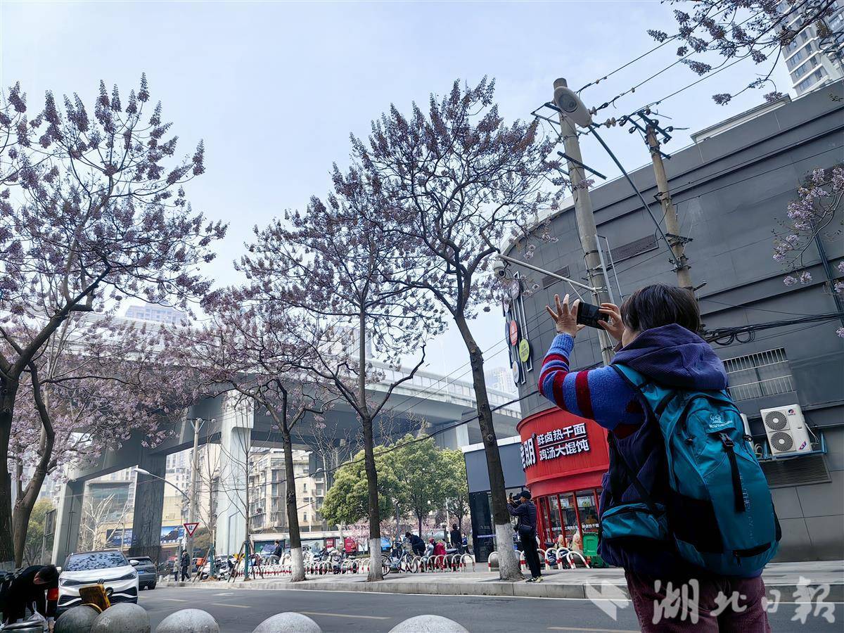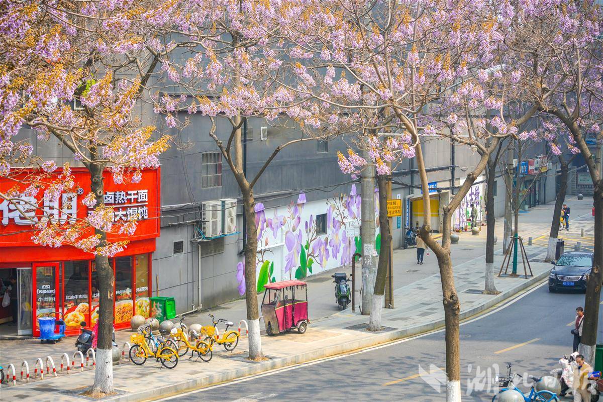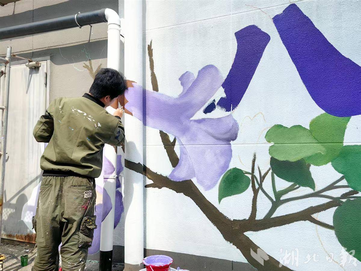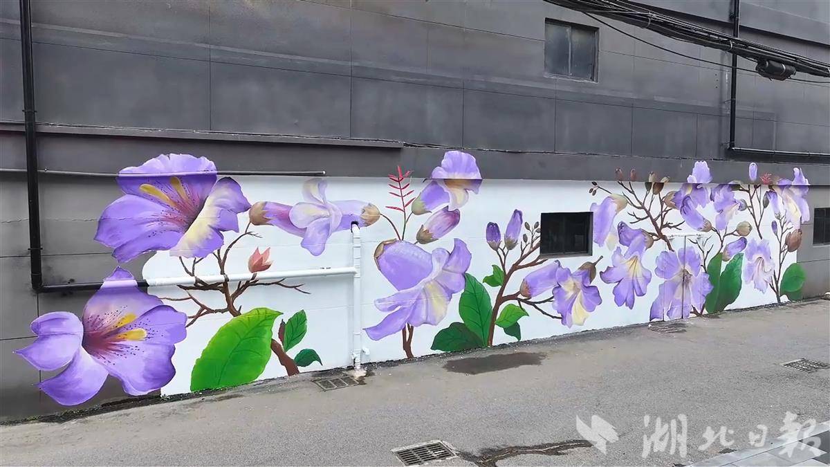 三月末的武汉,春意正浓。在武汉市江汉区八古墩东一巷,一场关于春天的“接力”正在悄然上演,这条长约200米的小巷里,78棵泡桐树沿街而立,正值花期。而在道路入口处的中百仓储外墙上,一幅以泡桐花为主题的手绘墙画即将完工。手绘花墙与真实花道相映成趣,引得路人纷纷驻足拍照。