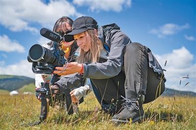 二〇二五年“看中国”活动中,来自英国的青年导演与中方制片人在赛里木湖附近的草原拍摄牧民。片方供图