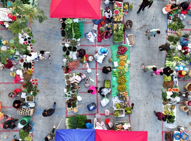 3月1日,人们在云南省西双版纳傣族自治州景洪市曼外村“山货集市”采购(无人机照片)。