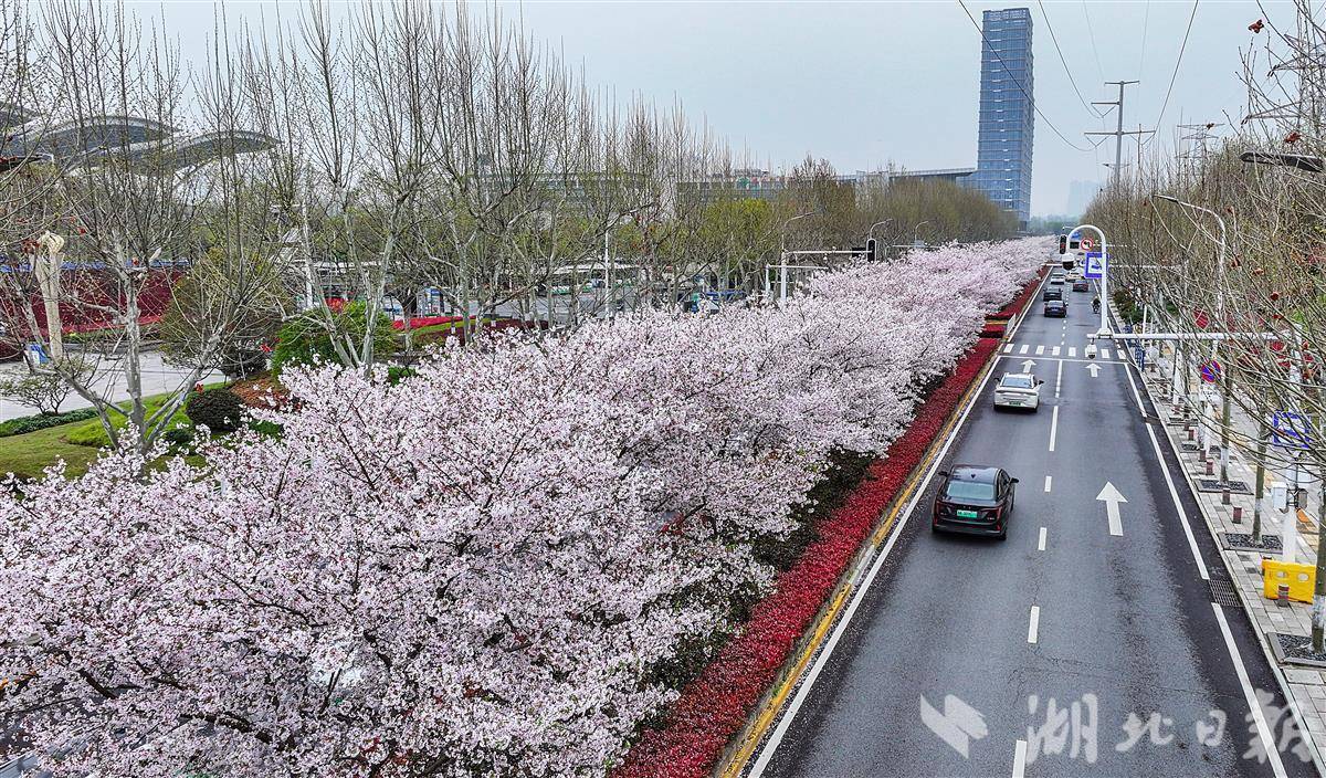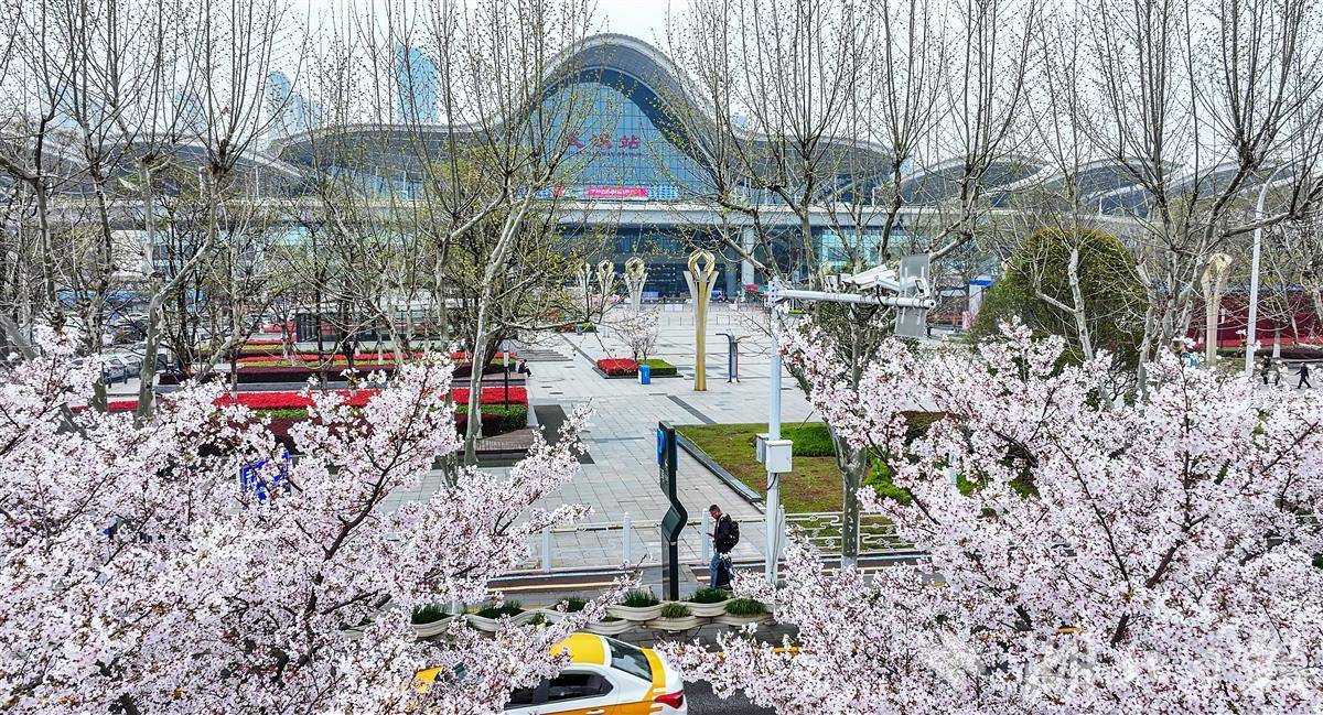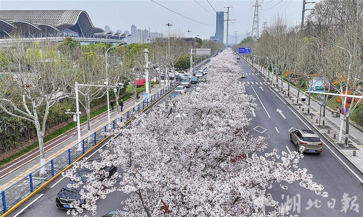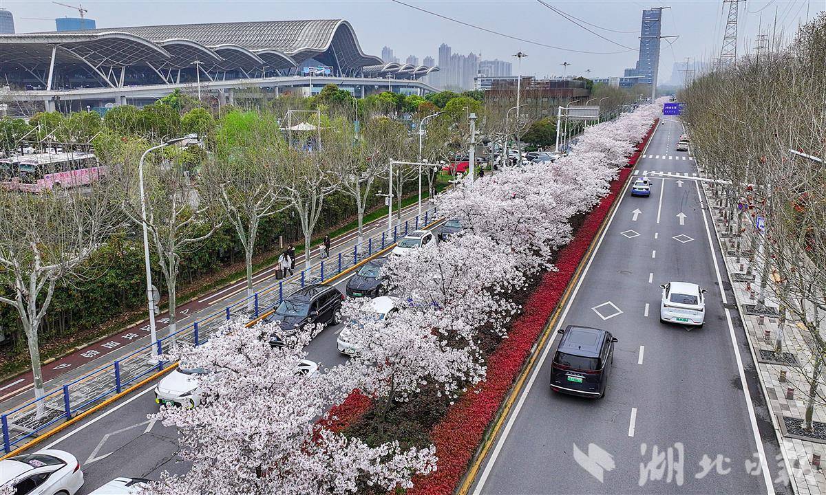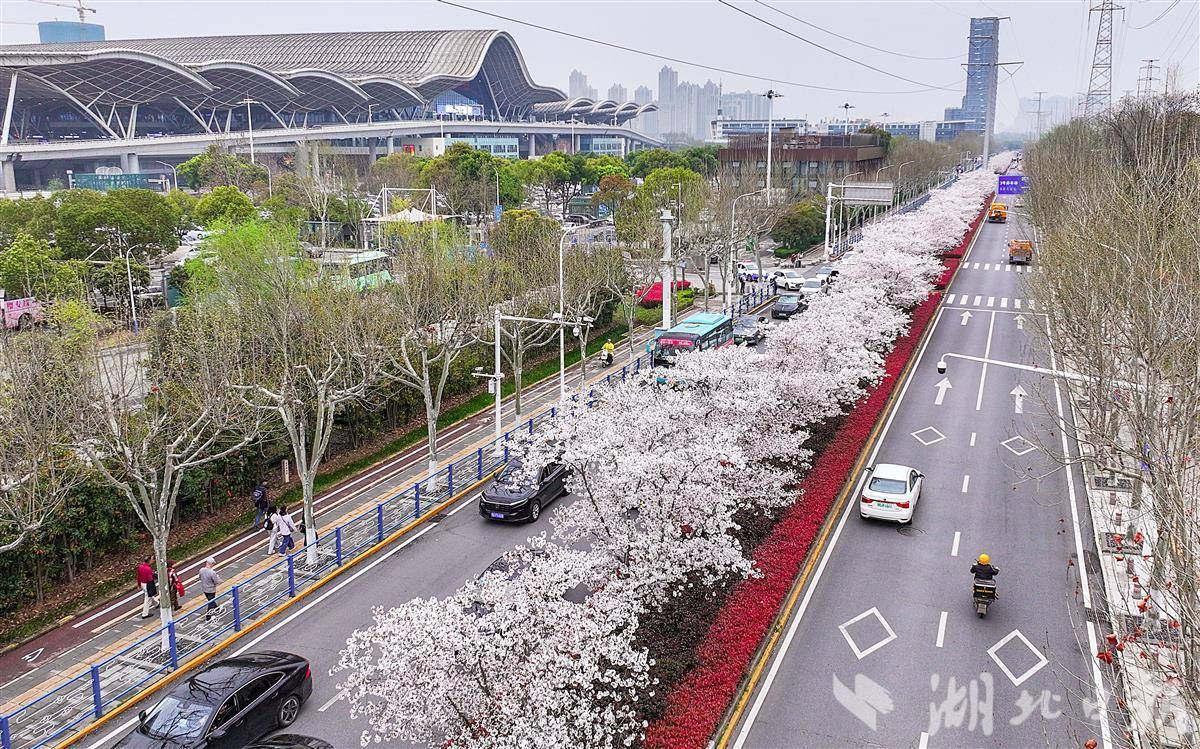 3月26日,许多旅客被武汉火车站东广场外雪白的樱花所吸引,这里的樱花长在白云路的路中花坛内,路长约1公里,共94株。微风吹过,花瓣飘落,为江城窗口地带平添一道美景。(湖北日报全媒记者 朱熙勇 摄)