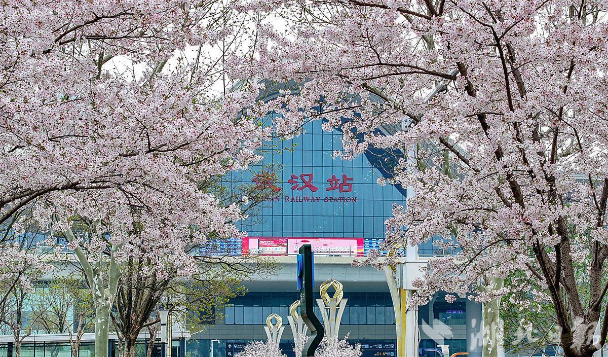 3月26日,许多旅客被武汉火车站东广场外雪白的樱花所吸引。