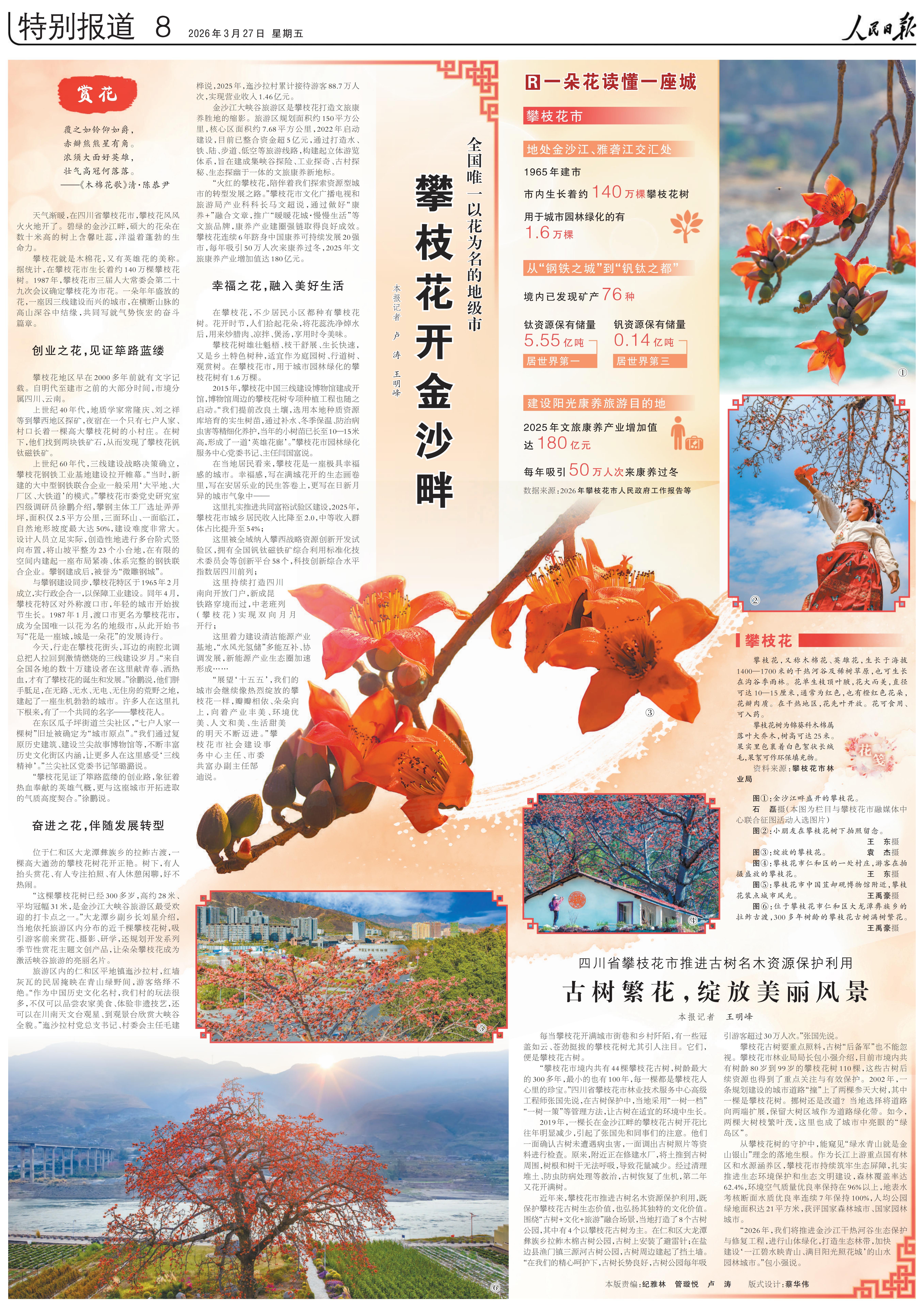 “火红的攀枝花,陪伴着我们探索资源型城市的转型发展之路。”攀枝花市文化广播电视和旅游局产业科科长马文超说,通过做好“康养+”融合文章,推广“暖暖花城·慢慢生活”等文旅品牌,康养产业建圈强链取得良好成效。攀枝花连续6年跻身中国康养可持续发展20强市,每年吸引50万人次来康养过冬,2025年文旅康养产业增加值达180亿元。