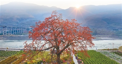 位于攀枝花市仁和区大龙潭彝族乡的拉鲊古渡,300多年树龄的攀枝花古树满树繁花。王禹豪摄