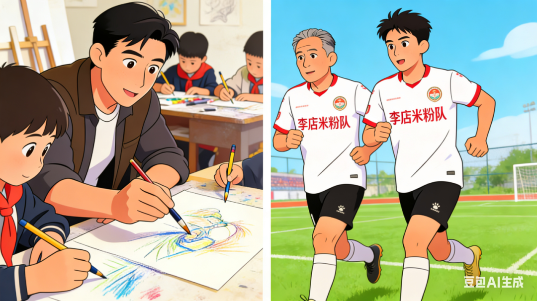 如今的李店米粉队,56岁的美术老师与20岁的体校学生并肩而立,穿着同样的队服,向着同一个球门奔跑。这是万子豪的第一次乡超,也是严剑波四十五年足球生涯的又一次出发,属于他们的足球故事,仍在安陆的绿茵场上继续书写。(何叶)