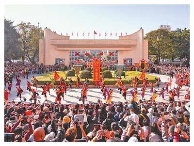 在广东省揭阳市普宁市南山村南山英歌队训练基地,每日晨昏都会响起一阵阵铿锵有力的鼓点与槌击声。基地内,英歌队队员们挥舞双槌练习动作,南山英歌队教练、普宁英歌国家级非遗代表性传承人陈来发在一旁仔细指导。“今年春节期间,我们参加了不少演出,看到那么多人喜欢英歌舞,大家训练起来更有劲了,都想表演得更好。”陈来发说。