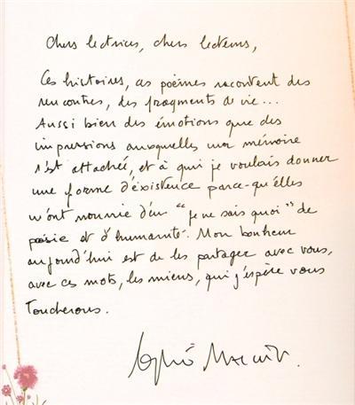 (我的)故事和诗歌,讲述的是一次次相逢的瞬间、一个个生活的片段……还有那些萦绕在记忆中的情感与印象。我想赋予它们一个存在的形式,因为它们曾用某种“我不知道是什么”的诗意和温情滋养了我。今天,我的喜悦就是将它们与你们分享,希望这些文字,我的文字,能触动你们的心弦。