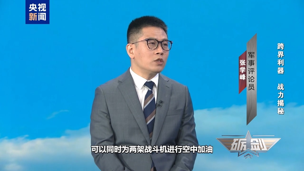 军事评论员 张学峰:运油-20A采用的是非常典型的软管加油方式。它的一个特点,就是可以同时为多架飞机加油,比如说,两侧的吊舱伸出来的软管可以同时为两架战斗机进行空中加油。它在中央部分还可以伸出一个比较大的锥管,主要是为大型飞机进行空中加油,比如说,大型运输机、预警机,包括轰炸机进行空中加油。虽然它能够同时伸出三个软管来,但基本上最多的时候可以同时为两架战斗机进行空中加油。
