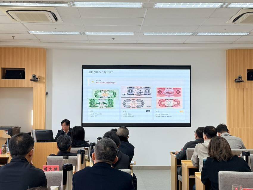 在这堂主题为“人民币与国家记忆”的微党课上,主讲人谈到,人民币不仅是流通的货币,更是记录中国经济发展与社会变迁的“国家名片”。每一张人民币的设计都反映了当时的政治、经济和文化特征,具有很高的历史研究价值与艺术鉴赏价值。如第二套人民币纸分币的正面图案就统一采用了交通运输工具。其中,“壹分”纸币为汽车,“贰分”纸币为飞机,“伍分”纸币为轮船。这方寸之间,呈现着中国实现工业化梦想的图腾。而“贰分”纸币的背面,更是有着一个特殊的“暗记”。