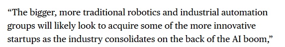 业内人士在文章中表示,随着行业的发展,投资逻辑可能会逐步从机器人本体及零部件,向其大脑、平台以及“该技术的物理AI层面”演进。“随着人工智能热潮推动行业整合,规模更大、更传统的机器人及工业自动化集团,很可能会寻求收购一些更具创新性的初创公司。”