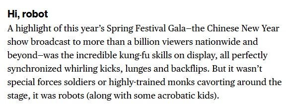 文章最后说,由此可见,未来几年机器人领域将迎来更多交易,春晚舞台上的机器人表演也将愈发精彩。