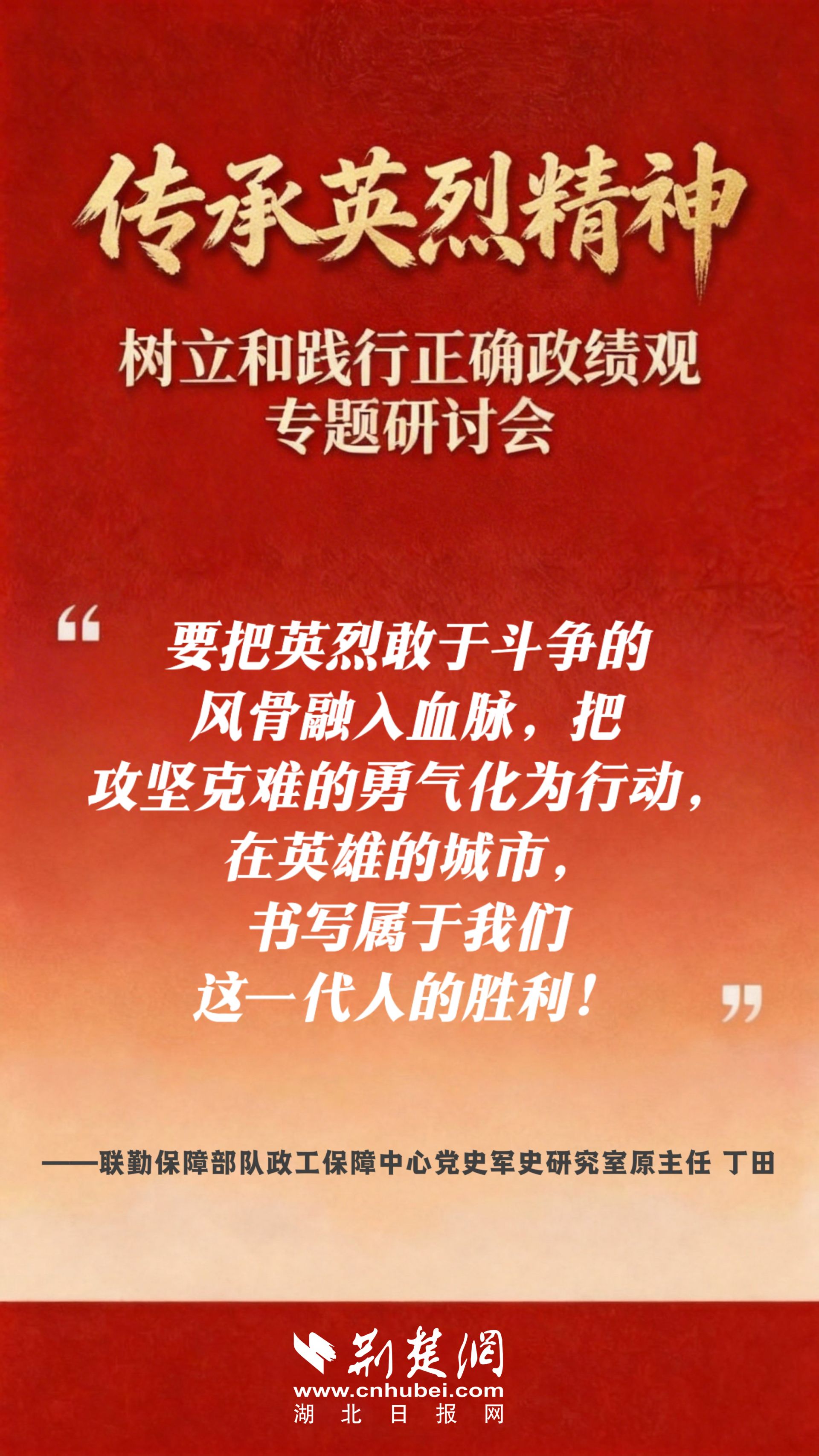 “作为一名老兵,深知军人的字典里没有‘退缩’二字。”丁田在研讨会上呼吁,让我们把英烈敢于斗争的风骨融入血脉,把攻坚克难的勇气化为行动,在英雄的城市,书写属于我们这一代人的胜利!