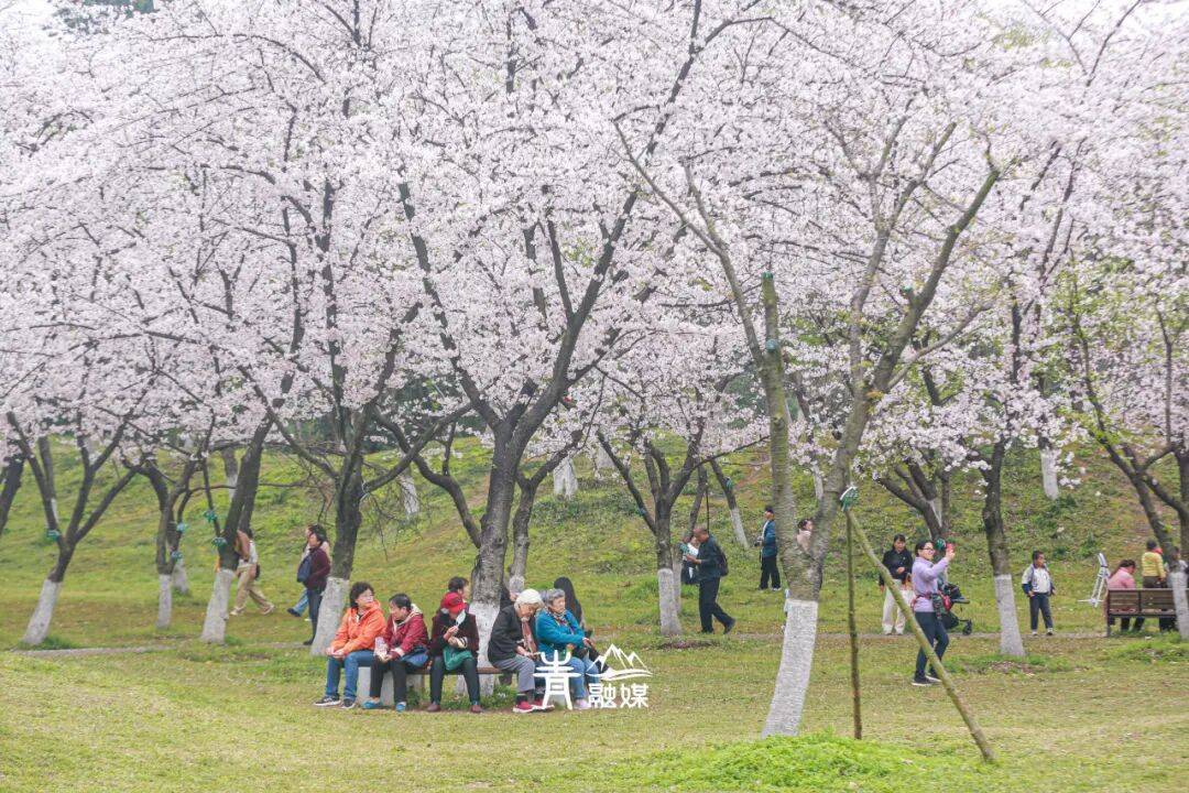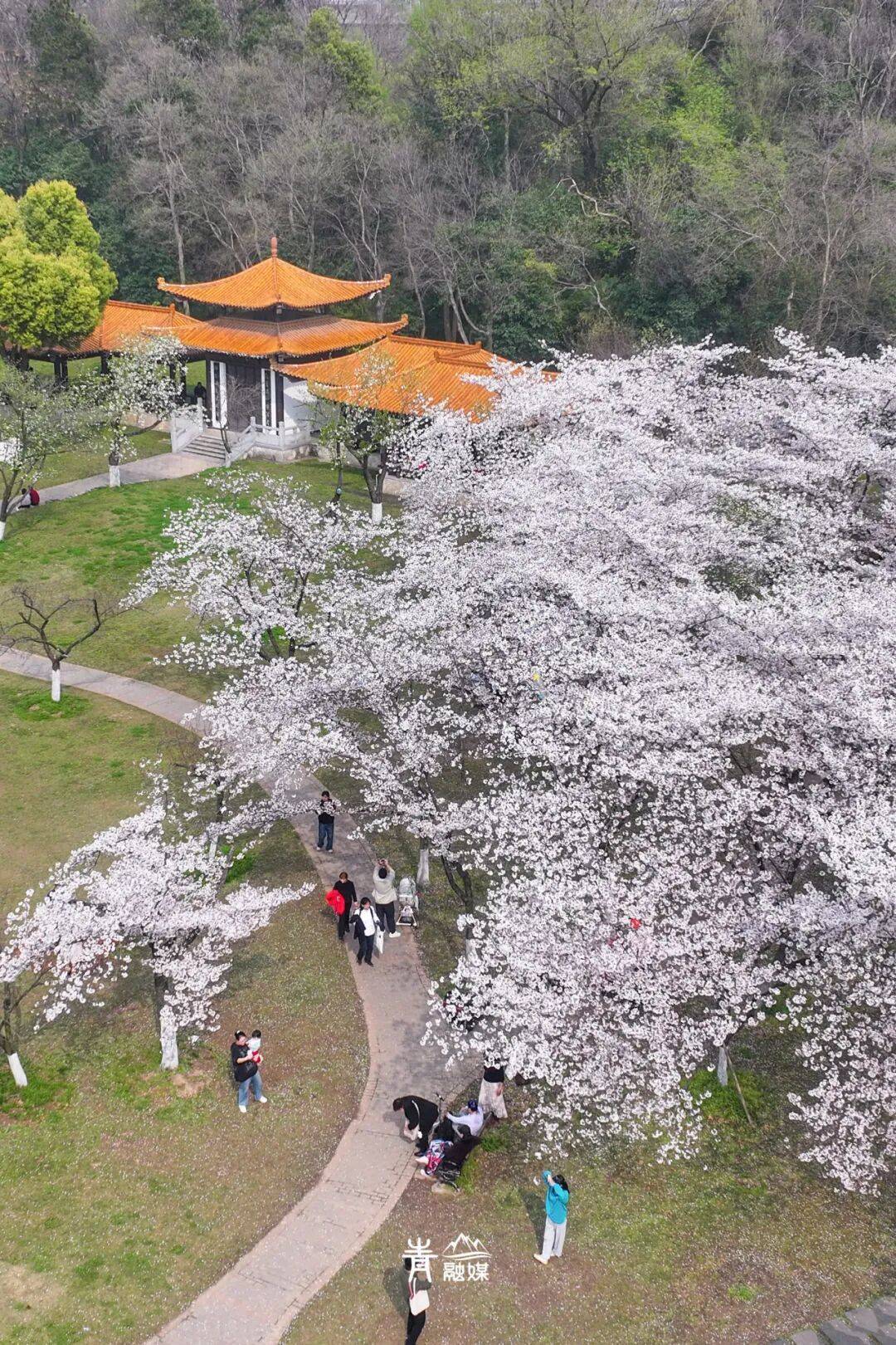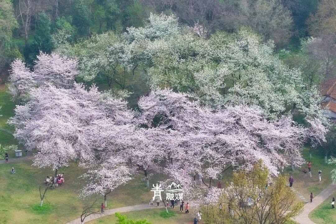走进青山公园落樱缤纷景区的樱花苑,2万平方米的樱花肆意绽放,形成一片壮阔的粉白花海。