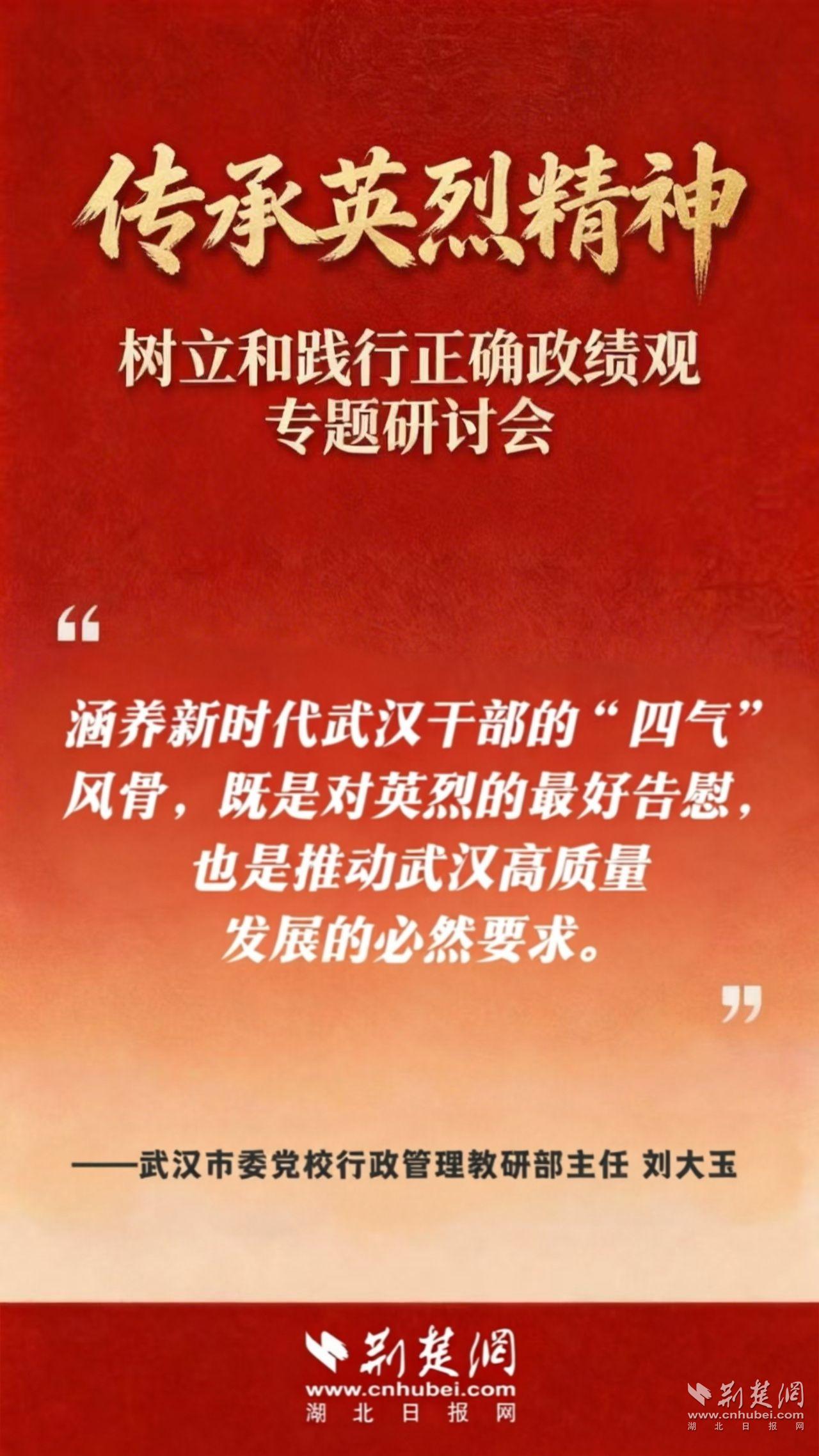 荆楚网(湖北日报网)讯(记者 白云 通讯员 王璐、朱姝颐)赓续英雄城市红色血脉,以英烈精神之光照亮新时代干部“政绩观”。3月27日,武汉市退役军人事务局组织召开“传承英烈精神,树立和践行正确政绩观”专题研讨会。研讨会上,武汉市委党校行政管理教研部主任刘大玉指出,要以英烈精神铸魂,涵养新时代武汉干部的“四气”风骨。