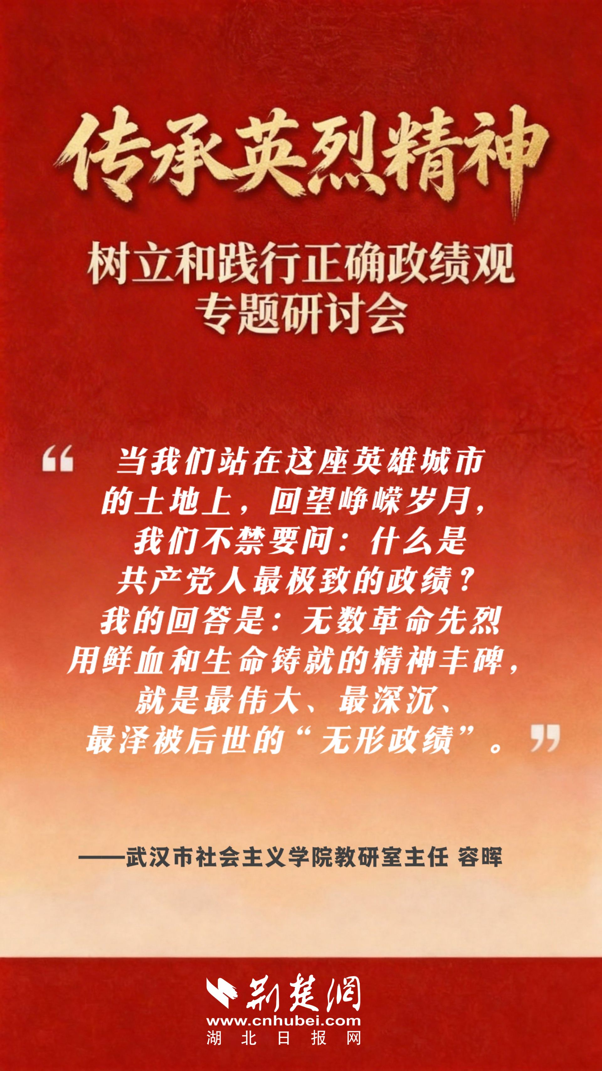荆楚网(湖北日报网)讯(记者 白云 通讯员 王璐、朱姝颐)赓续英雄城市红色血脉,以英烈精神之光照亮新时代干部“政绩观”。3月27日,武汉市退役军人事务局组织召开“传承英烈精神,树立和践行正确政绩观”专题研讨会。会上,武汉市社会主义学院教研室主任容晖在发言中表示,英烈们以生命铸就的无形政绩,是留给我们最宝贵的精神财富。