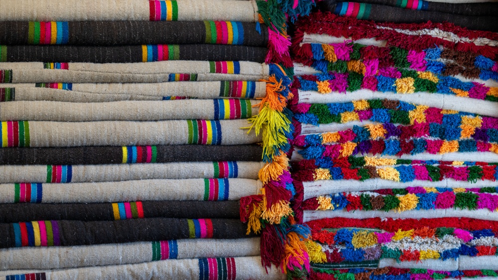 3月25日,西藏日喀则市岗巴县直克乡乃村顺心合作里整齐摆放的羊毛被。新华网 旦增努布 摄