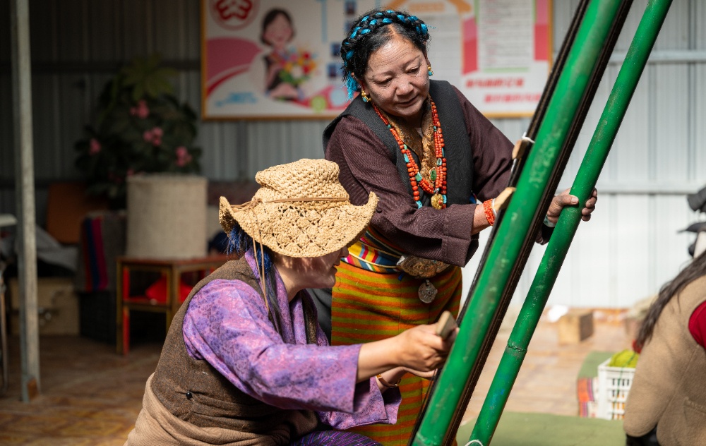 3月25日,西藏日喀则市岗巴县直克乡乃村顺心合作社负责人德吉给员工确吉指导编织技艺。新华网 旦增努布 摄