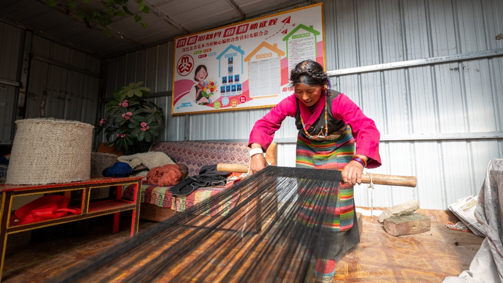 3月25日,西藏日喀则市岗巴县直克乡乃村顺心合作社员工在编织氆氇。新华网 旦增努布 摄