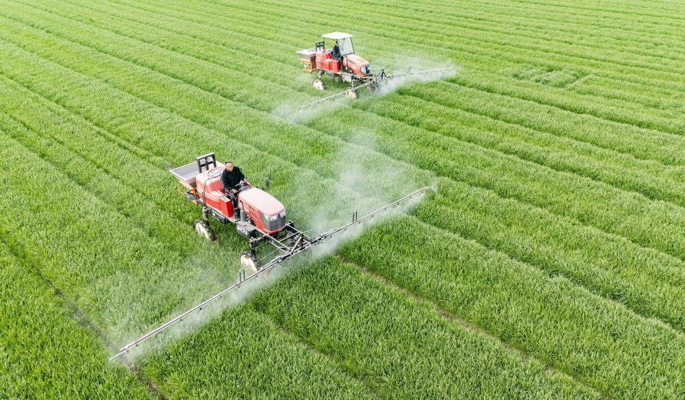 3月13日,在江苏省兴化市陈堡镇蒋庄村,农民驾驶植保无人机、自走式喷杆喷雾机实施杂草防治作业。新华社发