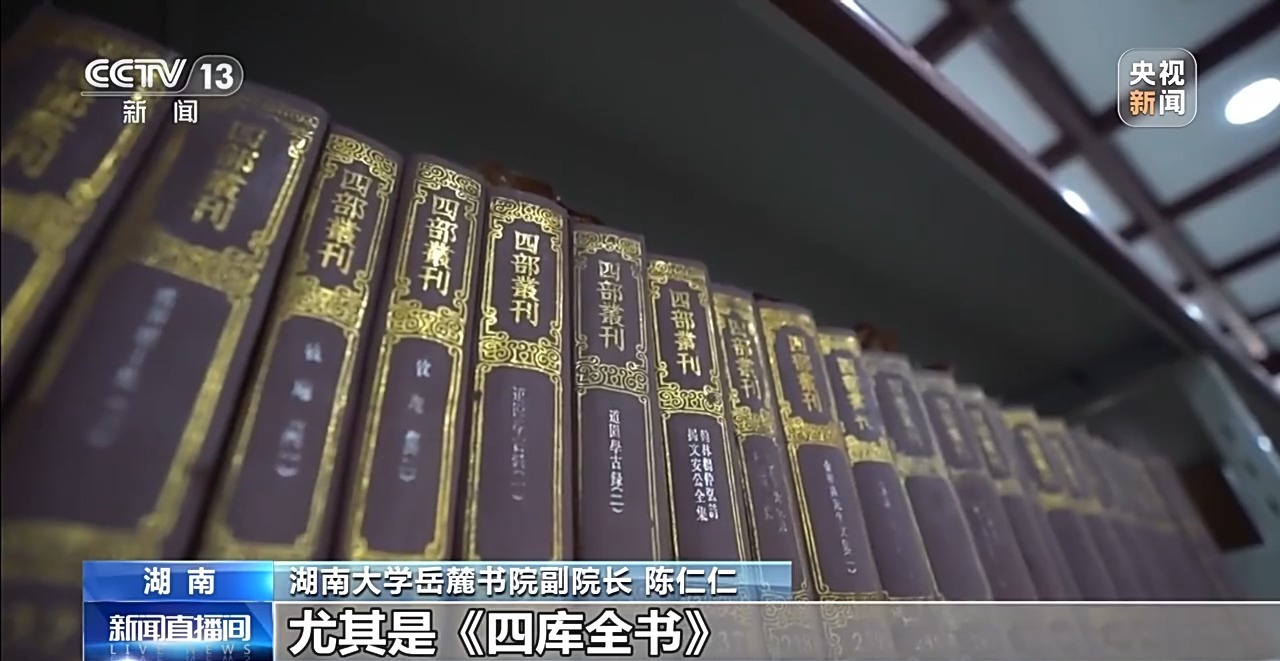 湖南大学岳麓书院副院长 陈仁仁:比如《四库全书》《续修四库全书》《四部备要》《四部丛刊》,尤其是《四库全书》,岳麓书院有三种版本。书不贵能藏,贵能读,今天御书楼里头的藏书依然还在使用,供老师和同学们借阅,大家利用这些书来理解这个世界。