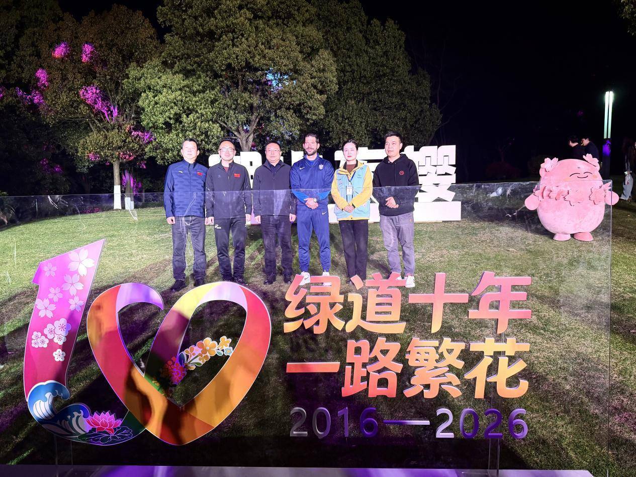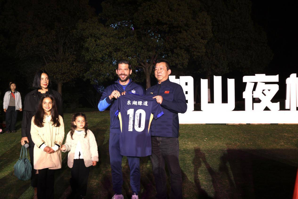 活动融合文体旅元素,邀请武汉三镇足球队墨西哥籍主教练莫拉先生担任嘉宾,为仪式增添国际色彩与体育活力。东湖音乐节快闪表演以樱花与运动主题的曲目开场,现场气氛热烈。嘉宾访谈环节,绿道一期客服部驿站管家吴凤回顾十年建设历程,市民游客代表、知名播主“侃叔侃书”分享在东湖畔的幸福点滴。莫拉先生表达对东湖的喜爱,并代表武汉三镇队向东湖文旅代表赠送印有“东湖绿道”和10号的球衣,送上对东湖绿道的祝福。