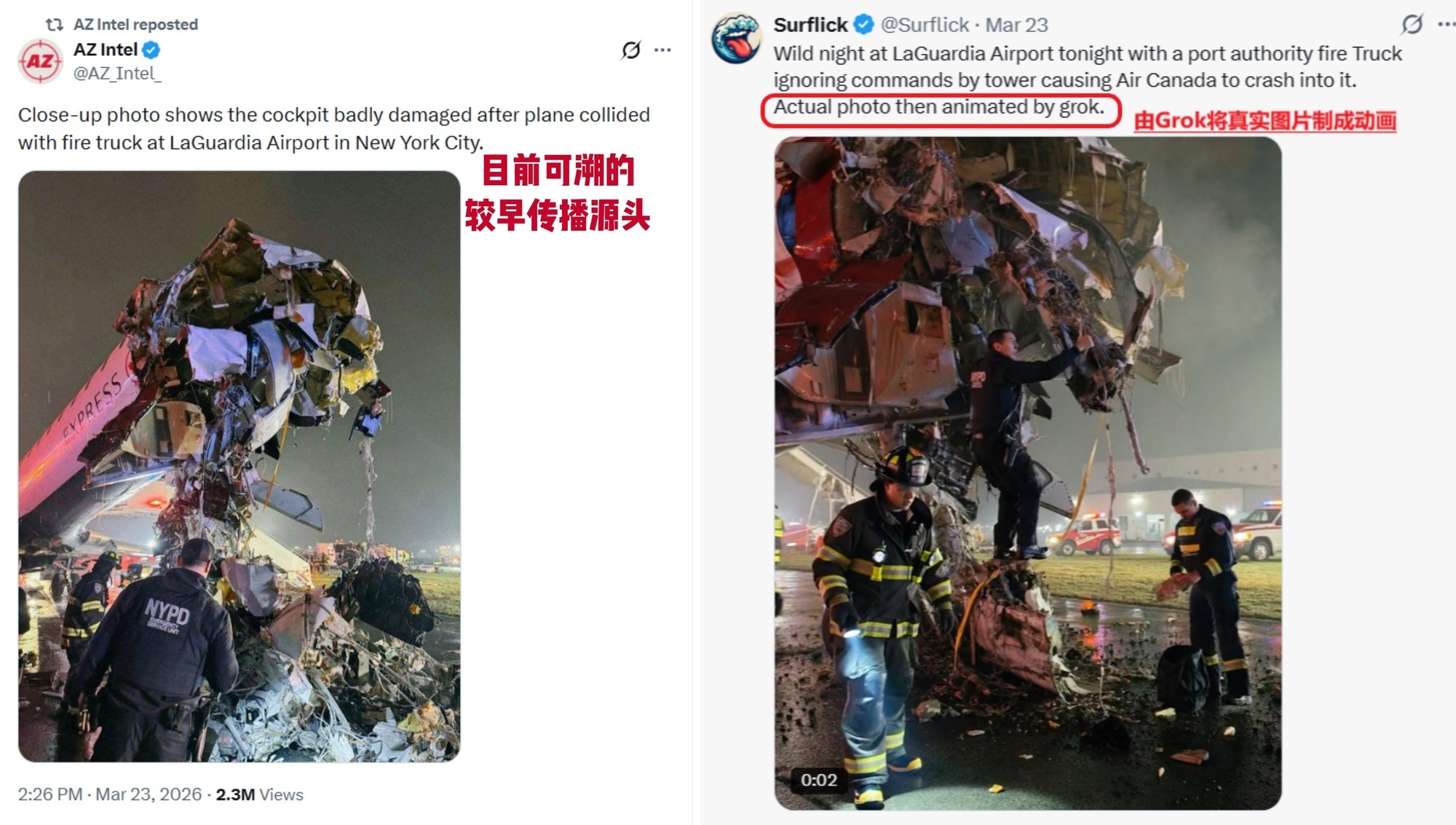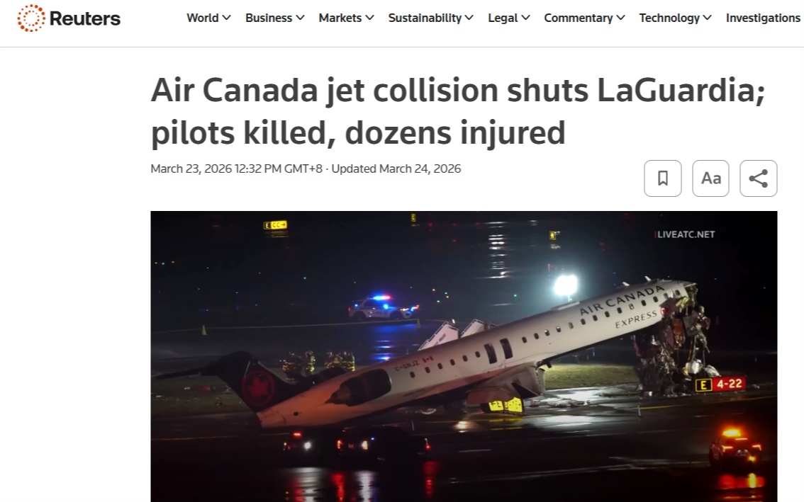 先看事故本身。当地时间3月22日晚,一架加拿大航空快运客机在纽约拉瓜迪亚机场降落时,与一辆机场消防救援车相撞,造成两名飞行员死亡、多人受伤。也就是说,事故是真的,伤亡情况也是真的。