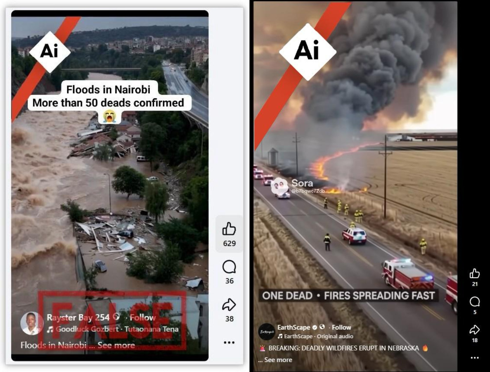 这起事件最值得警惕的地方,不是“事故是假的”,而是“真事故+假视频形态”。类似情况,近期并不少见。比如,3月肯尼亚内罗毕洪灾造成至少70人死亡后,社交平台上很快出现多段所谓“灾情现场视频”和图片,后经核查发现,其中一些内容其实是AI生成,并非真实灾区画面。
