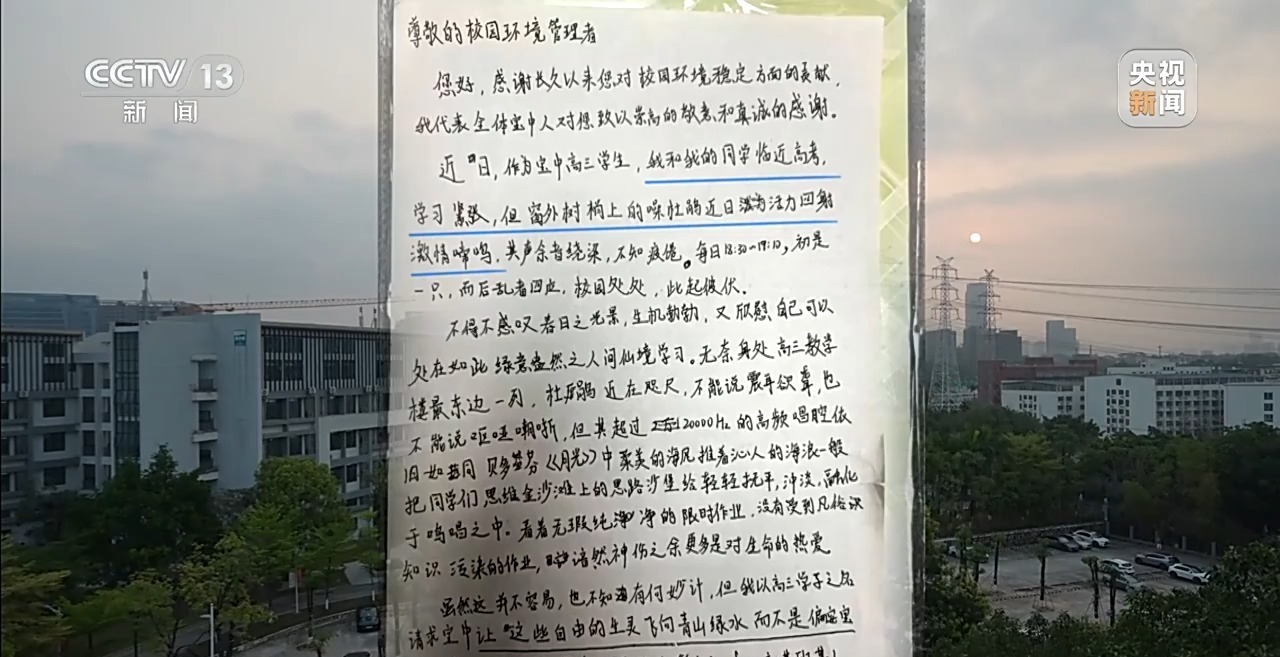 于是,这位义愤填膺的男生,带头给校长写了一封信,“我和我的同学临近高考,学习紧张,但窗外树梢上的噪鹃近日活力四射,激情啼鸣。请求让这些自由的生灵飞向青山绿水,请派专人拆除鸟巢!”