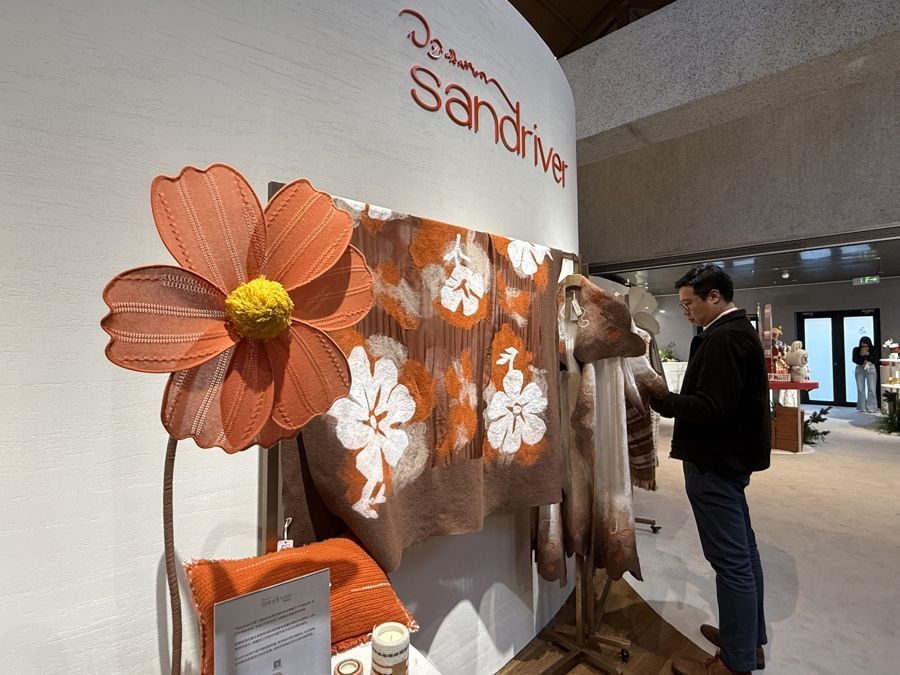 “踏花影”区域是一个五感体验的沉浸空间。艺术羊绒品牌Sandriver沙涓现场还原了日喀则羊绒氆氇工坊、果洛牦牛绒氆氇工坊的织机操作,匠人以双手穿梭,在经纬交错间演绎“高原的温度”,消费者能近距离观看从捻纱到成胚的全过程,感受这一非物质文化遗产的匠心精神。沙涓品牌负责人介绍,品牌将首发羊绒睡袍系列新品、马年主题哈尼绣系列以及羊绒艾德莱斯家居毯等作品,展现传统工艺与当代生活美学融合的羊绒设计。