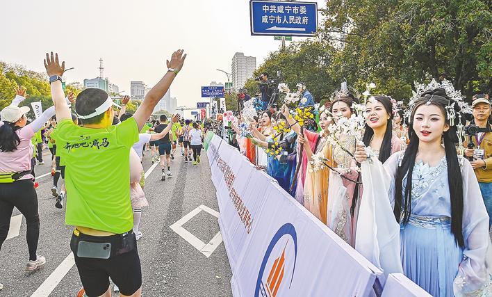 ▲3月29日,2026咸宁马拉松的跑者们与美女啦啦队互动。 (湖北日报全媒记者 朱熙勇 摄)