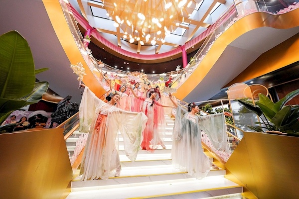 随后,开场国风舞蹈《十二花神·踏春归》惊艳亮相,十二花神身着华服,步履轻盈,衣袖翩跹,宛若春日繁花次第绽放,将春日荆楚的温婉柔美与盎然生机演绎得淋漓尽致,瞬间点燃整个甲板的氛围,也拉开了长江之夜的唯美帷幕。
