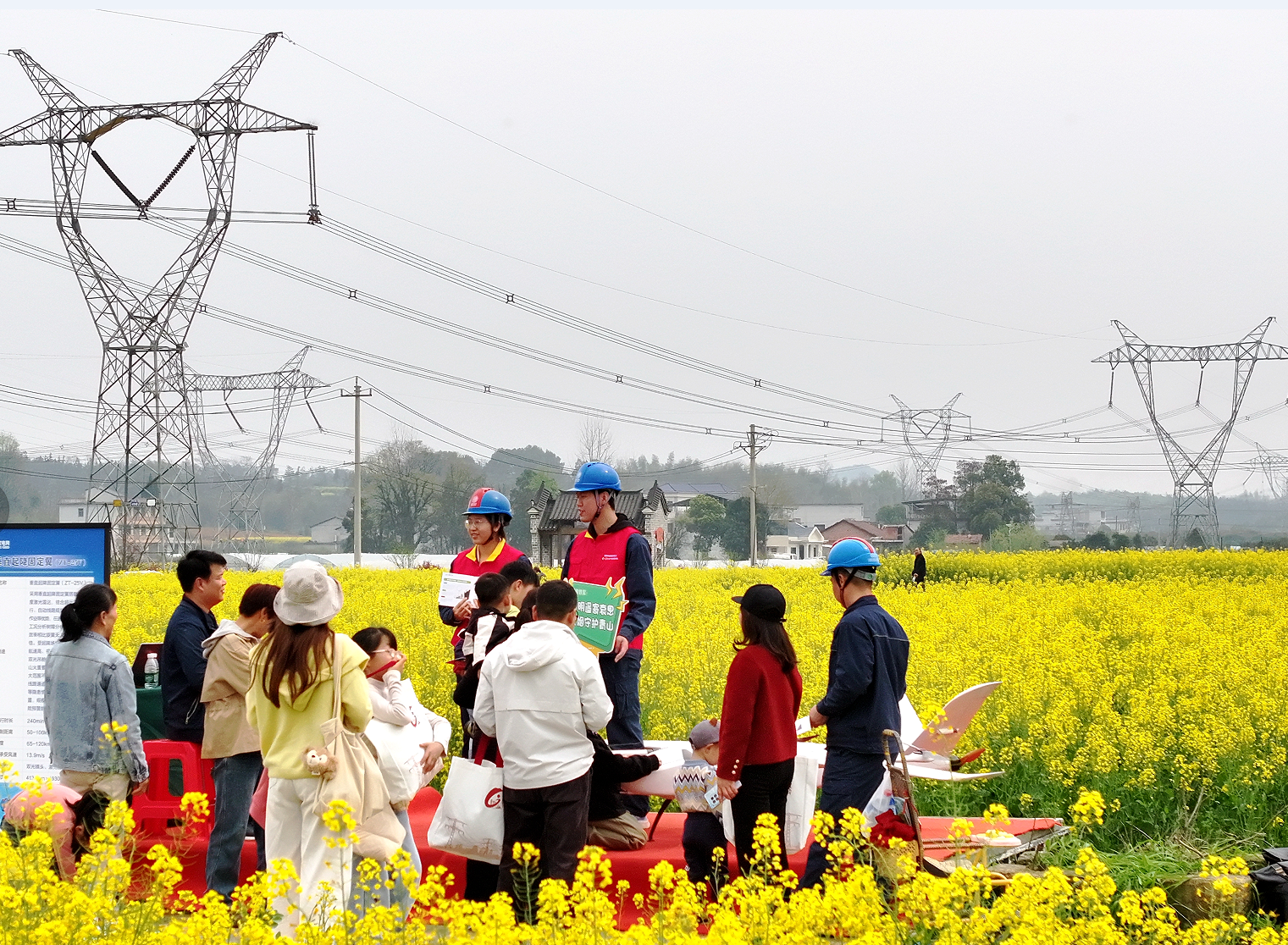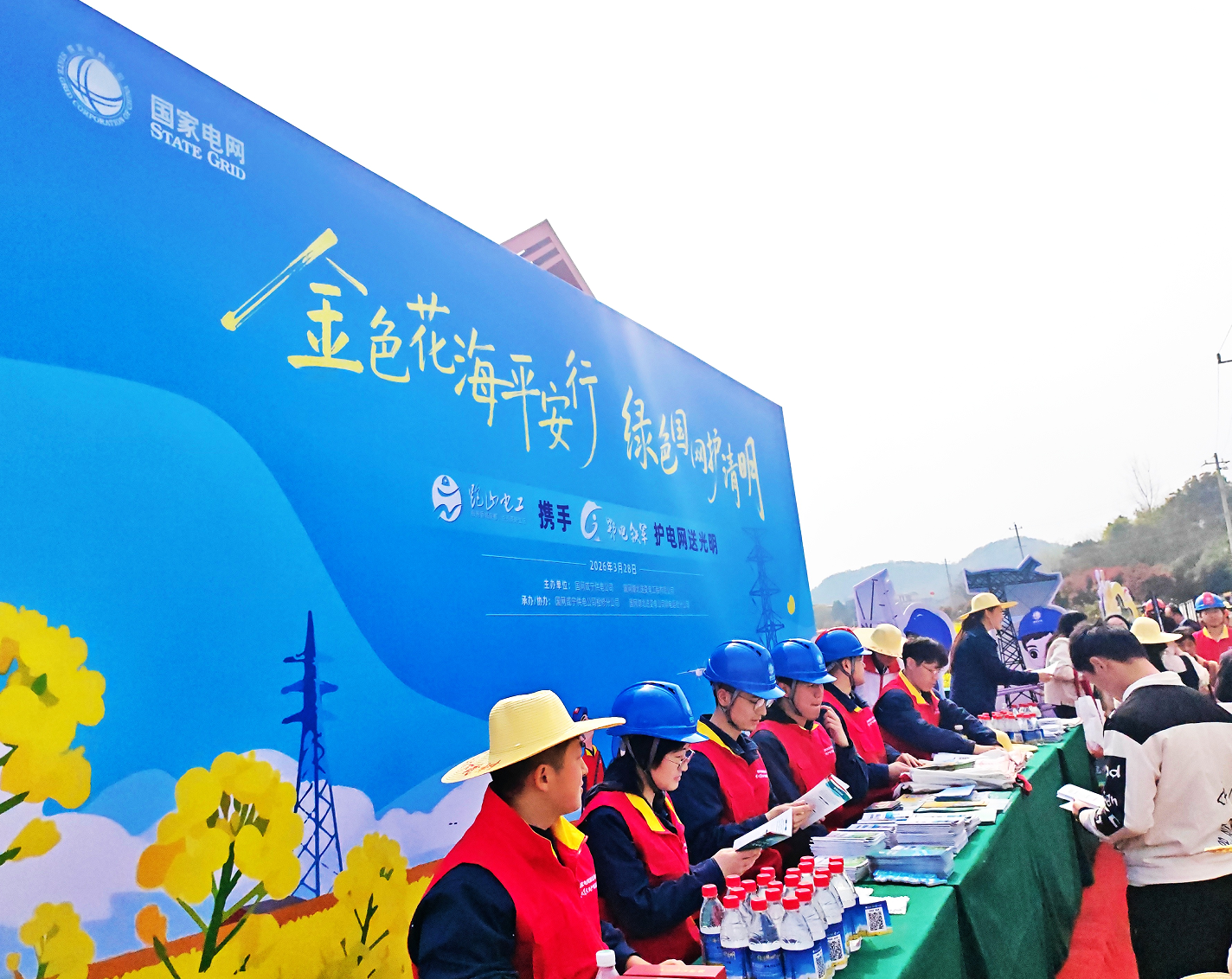 在花海里“摆摊”,目的明确:借踏青人流,播下电力安全的种子。清明临近,咸宁山区森林覆盖超50%,输电线路穿行群山,山火风险陡增。将宣传点前置到金色花海,是一场精心策划的“伏击战”——在游人最松弛时,把严肃的安全提醒,种进春光里。