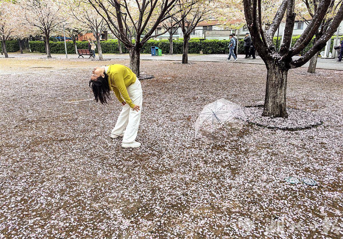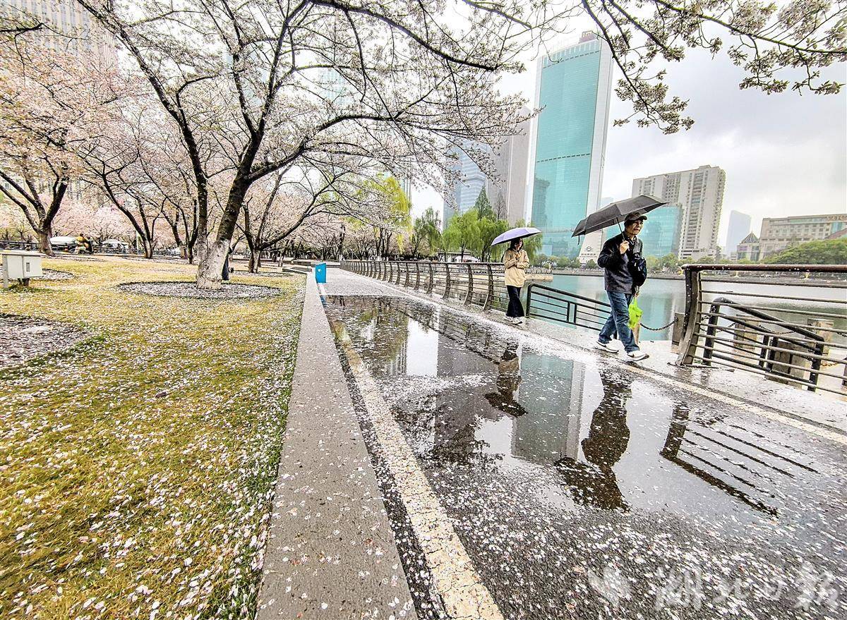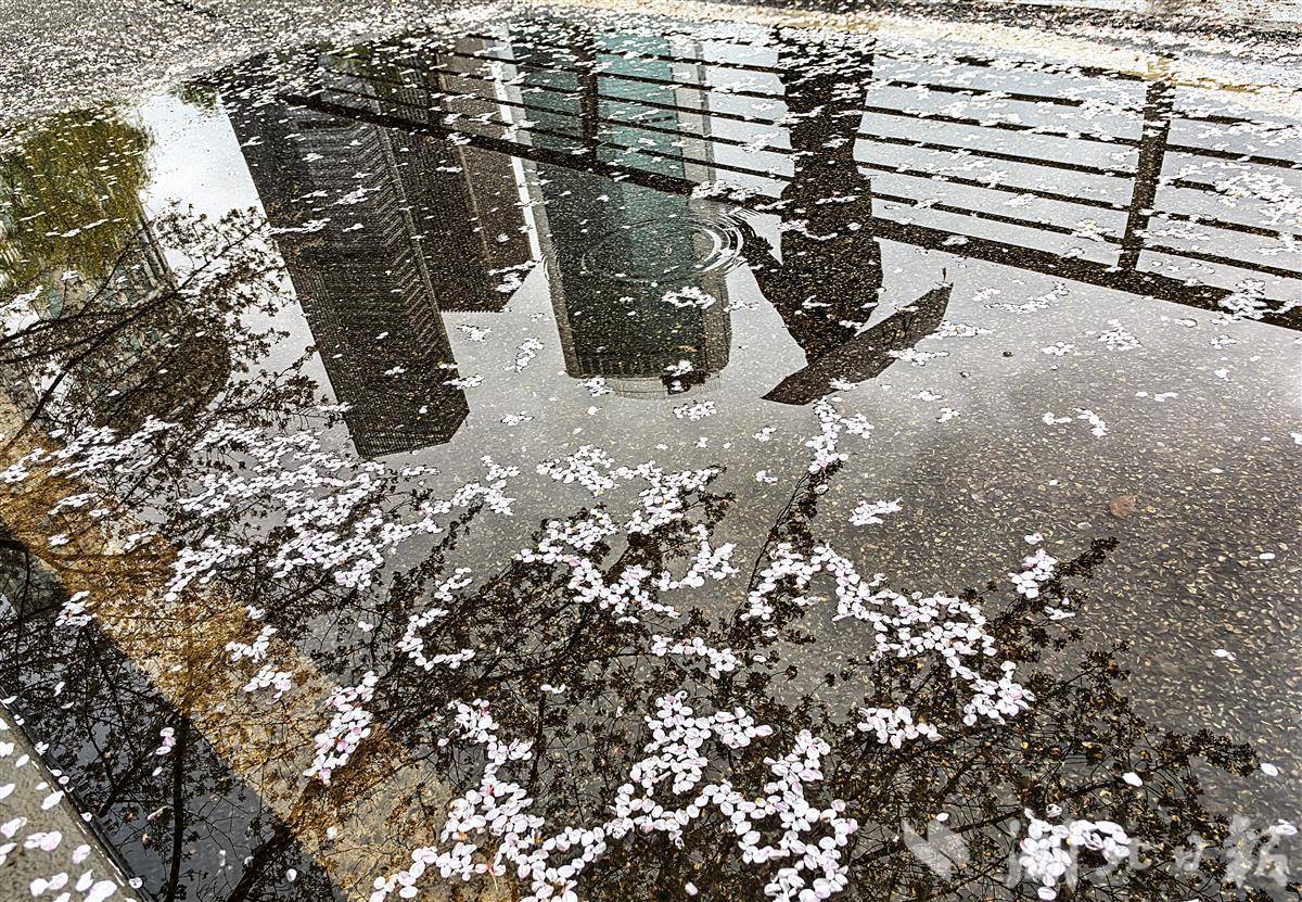 3月30日,一场风雨过后,武汉西北湖广场网红樱花林的地上、道路上盖着一层薄薄的樱花瓣。