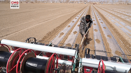 在高标准棉田里,两台搭载北斗导航系统的现代化棉花播种机来回穿梭,覆膜、播种、覆土等工序一气呵成,一台机器一天可完成上百亩地的播种任务,还能实现无人驾驶、精准直线播种、地膜覆盖、滴灌带铺设等多种工作,播种效率较传统方式大幅提升。