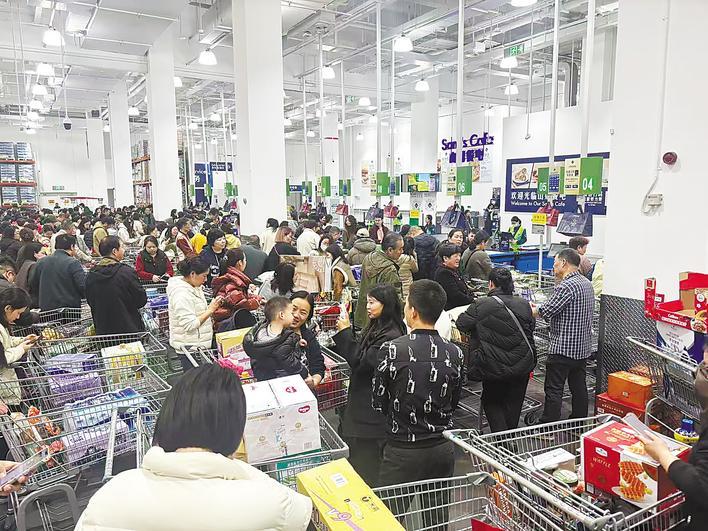 3月23日上午10时,武汉春雨绵绵,即便天公不作美,位于汉阳连通港路的山姆会员店内却依然人声鼎沸。数百名市民推着购物车有序结账,十余个收银台全速运转,扫码枪的清脆声响、打包带的摩擦声与购物车滚轮声交织在一起,勾勒出江城春日里火热的消费场景。