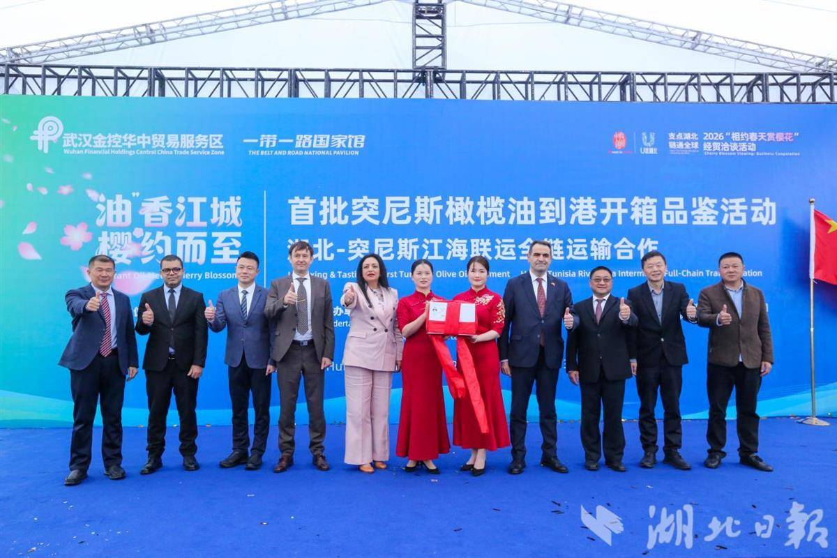 当天,“首批突尼斯橄榄油到港开箱品鉴活动暨湖北—突尼斯江海联运全链运输合作仪式”在武汉阳逻国际港区中远海运CSP码头举办,突尼斯、土耳其驻华使节、俄罗斯驻武汉总领事,湖北省、武汉市相关部门及企业负责人等嘉宾出席,共同见证突尼斯橄榄油首次以江海联运模式直达阳逻港,标志着鄂突经贸物流合作迈入全链条新阶段。
