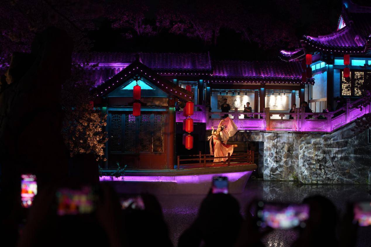 风雨过后,樱园依然热闹。漫步园中,落英铺径、繁花满枝,游客或驻足拍照或漫步花间,尽享春日盛景。景区持续优化服务,每日7时至22时开放,打造“日赏繁花、夜观灯影”的全时段赏樱体验,配套国风演艺、文创市集等活动,让游客沉浸式感受东湖樱韵之美。