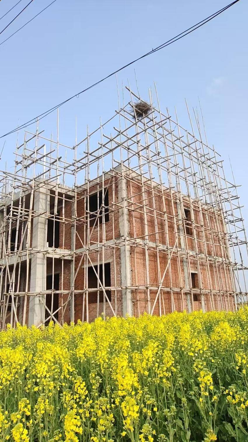 不是资金问题,也不是天气原因,而是一对喜鹊,在脚手架缝隙间衔来枯枝与细藤,筑起小小的巢。
