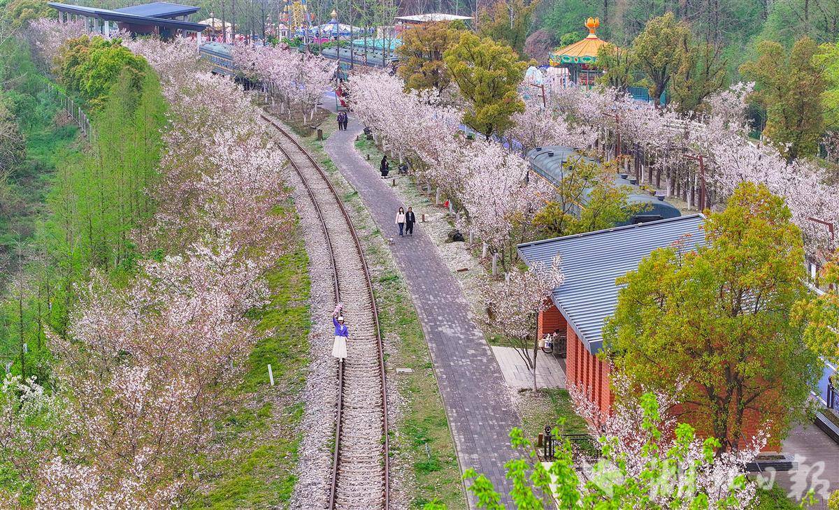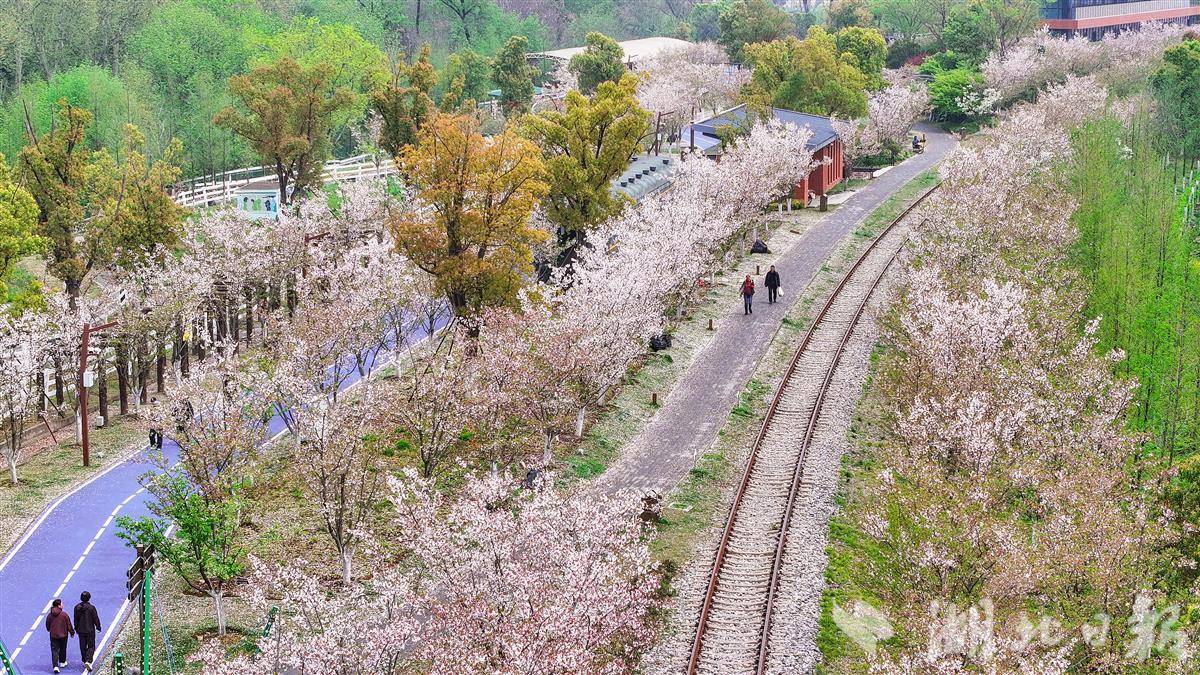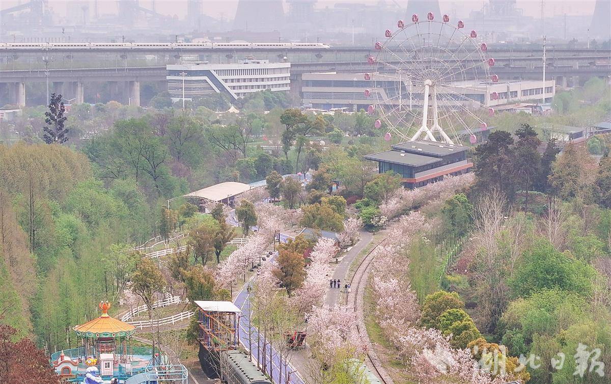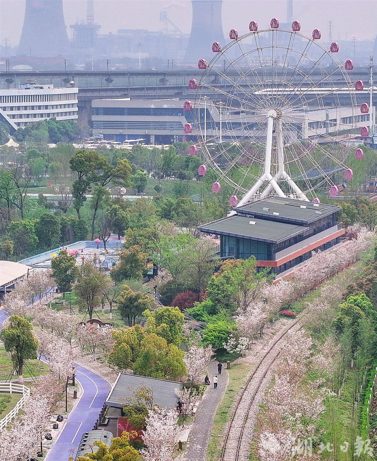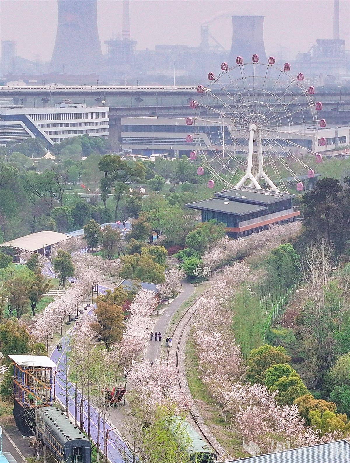 3月31日,武汉青山火车文化主题乐园樱花满天飘落,许多游人站在铁路上,与摩天轮、铁轨、樱花同框,随手拍摄的是大片。