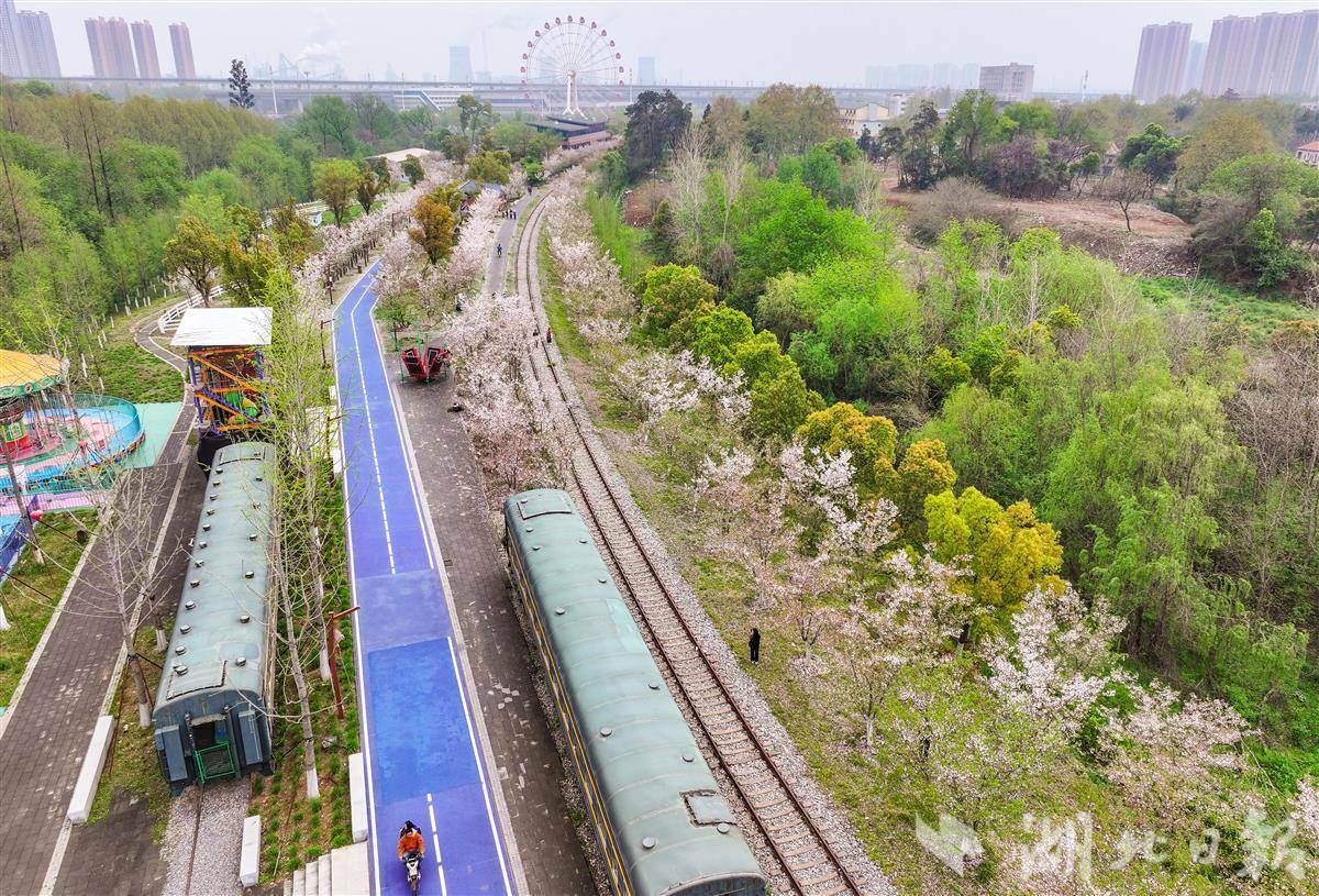 3月31日,武汉青山火车文化主题乐园樱花满天飘落,许多游人站在铁路上,与摩天轮、铁轨、樱花、列车同框,随手拍摄的是大片。该乐园是一个非常值得一去的地方。无论你是火车爱好者、历史文化爱好者还是自然风光爱好者,都可以在这里找到属于自己的乐趣。(湖北日报全媒记者 朱熙勇 摄)