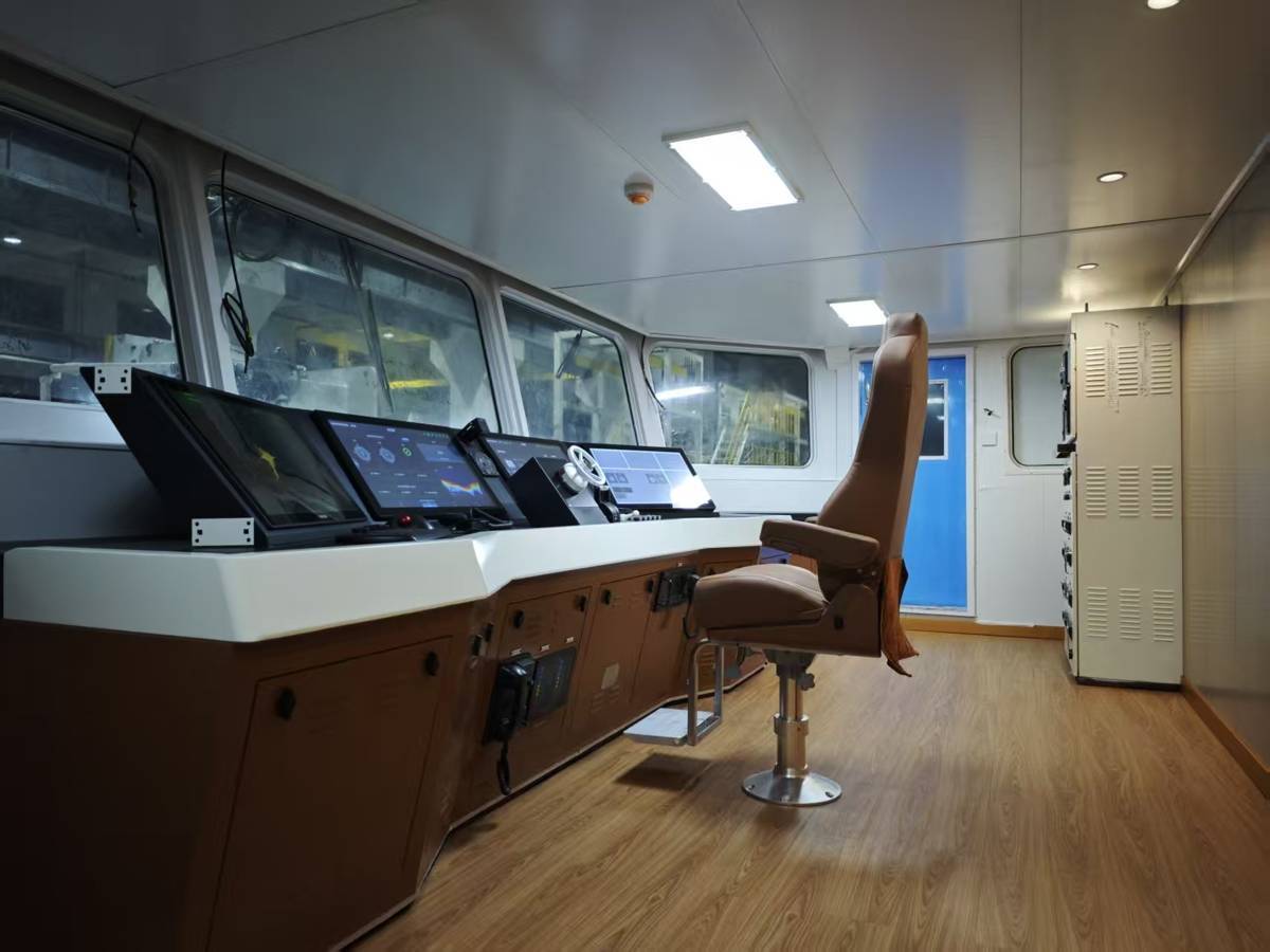 据介绍,该智慧驾驶舱是一个高度集成的现代化船舶“大脑”。从实验室里的模块测试、代码编写、系统模拟,到专业工厂内的模块化建造与内部集成,再到最终现场的实船吊装,每一步都凝聚了研发人员的智慧与汗水。这款智能驾驶舱不仅具备传统船舶的航行驾驶、雷达感知、无线电通信等基础功能,更融入了360辅助靠离泊、前景态势感知、语音大模型等先进的智能技术与数据分析能力。其搭载的态势感知、智能交互等核心功能,可实时提示碰撞风险。