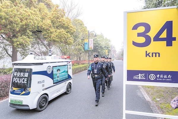 巡特警队员在“汉马”赛道与无人警车步巡