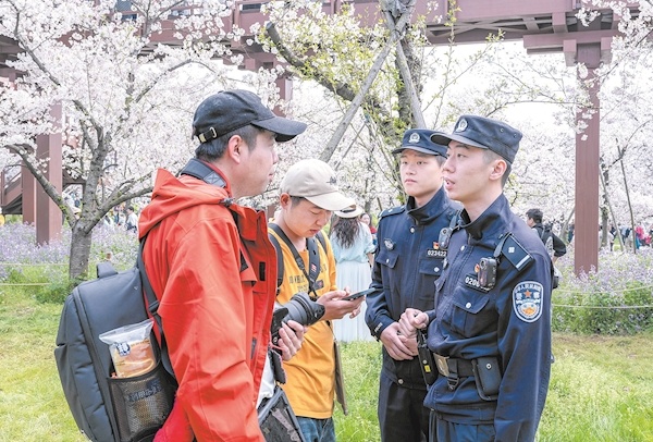 巡特警大队队员在东湖樱花园护航游客