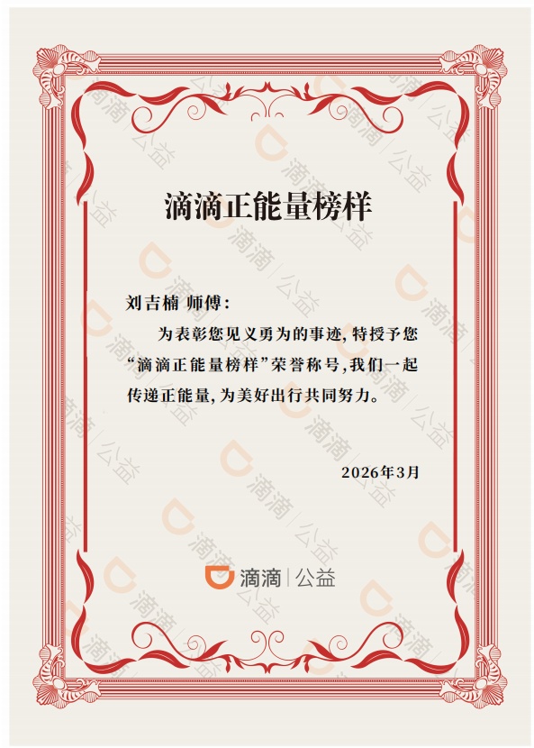据悉,为表彰这份凡人善举,滴滴公益已通过“正能量在路上”专项计划,授予刘吉楠“滴滴正能量榜样”称号,并发放3000元正能量奖励。