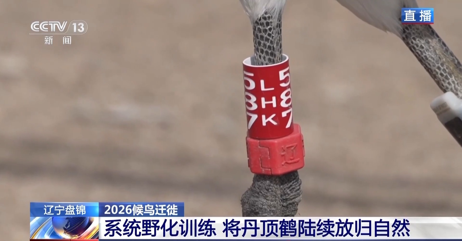 左腿上方红色的是环志,上面有辽河口拼音首字母的LHK和三位数字,这就相当于丹顶鹤的身份证。下方3D打印的红色彩环代表小鹤2025年的出生年份。