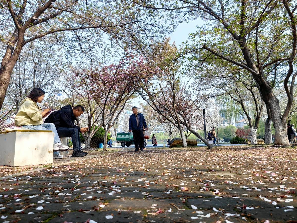 “这是我们今年特别推出的举措。”西北湖绿化广场管理中心主任向丽华介绍,“缓扫不是不扫,而是通过精细化作业,在‘留景保洁两不误’的原则下,让落樱成为景观的一部分。”