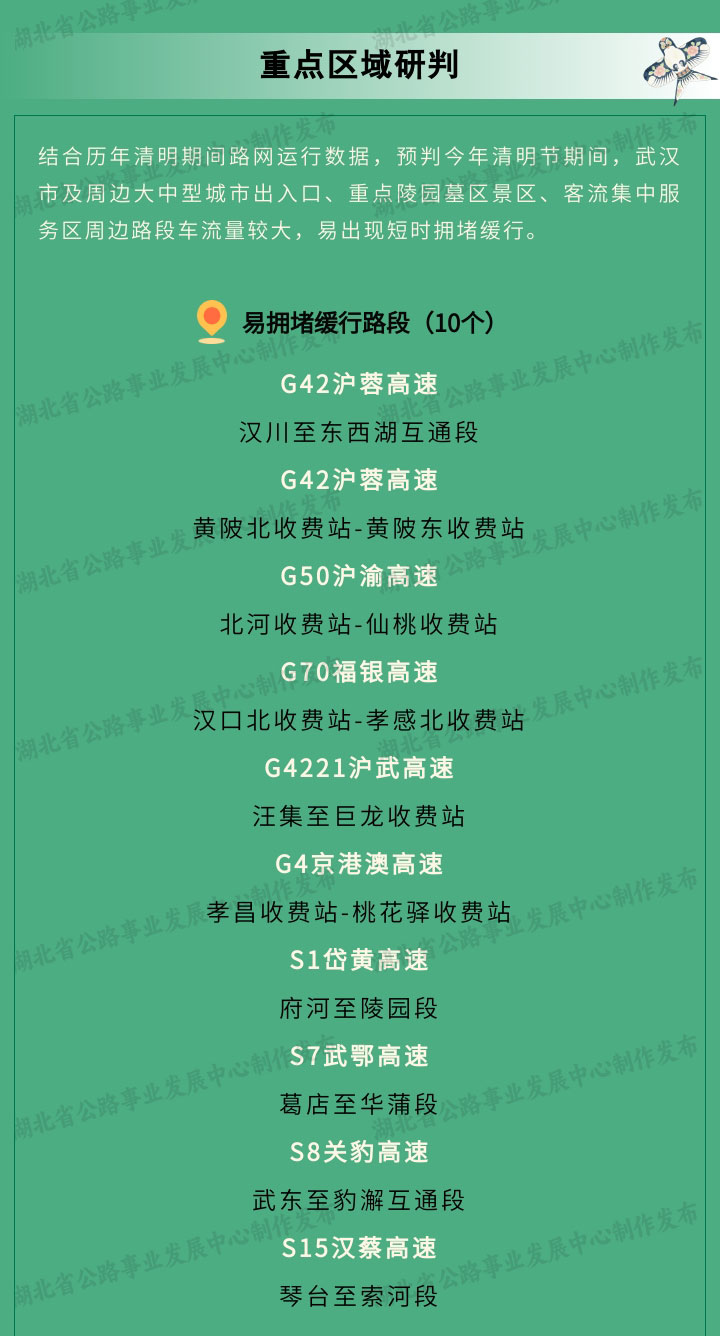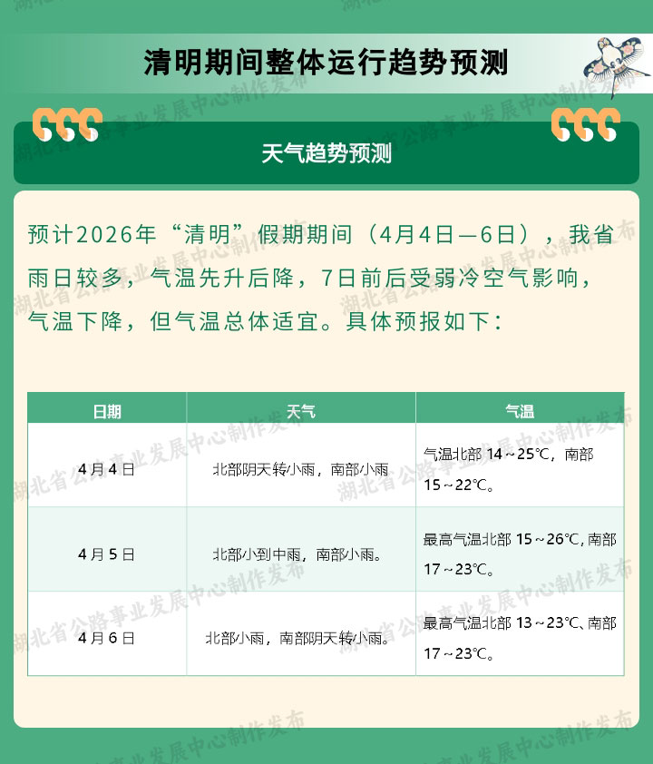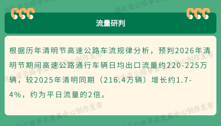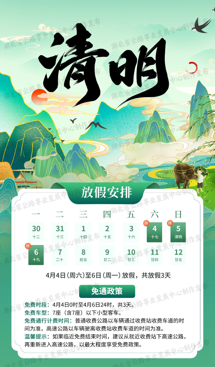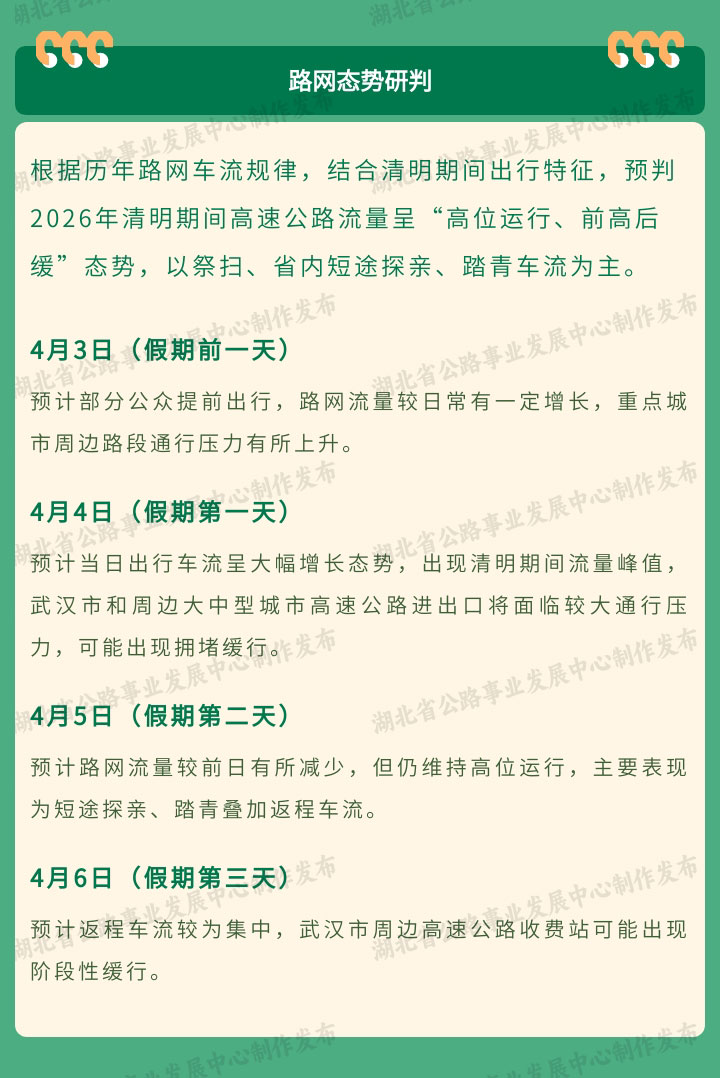 荆楚网(湖北日报网)讯(通讯员田臣 杨冰华 徐晨琛)2026年清明假期即将到来,放假时间为4月4日至4月6日,共计3天。湖北省公路事业发展中心根据历年清明假期全省公路网运行监测情况分析,预计清明假期期间,清明祭扫、踏青出游等出行需求集中释放,叠加高速公路免费通行政策影响,城市周边高速公路、景区及陵园、墓地邻近路段短途出行车流将大幅增长,高速公路流量呈“高位运行、前高后缓”态势。现编制《2026年清明假期湖北省干线公路出行指南》,为公众平安便捷出行提供参考。