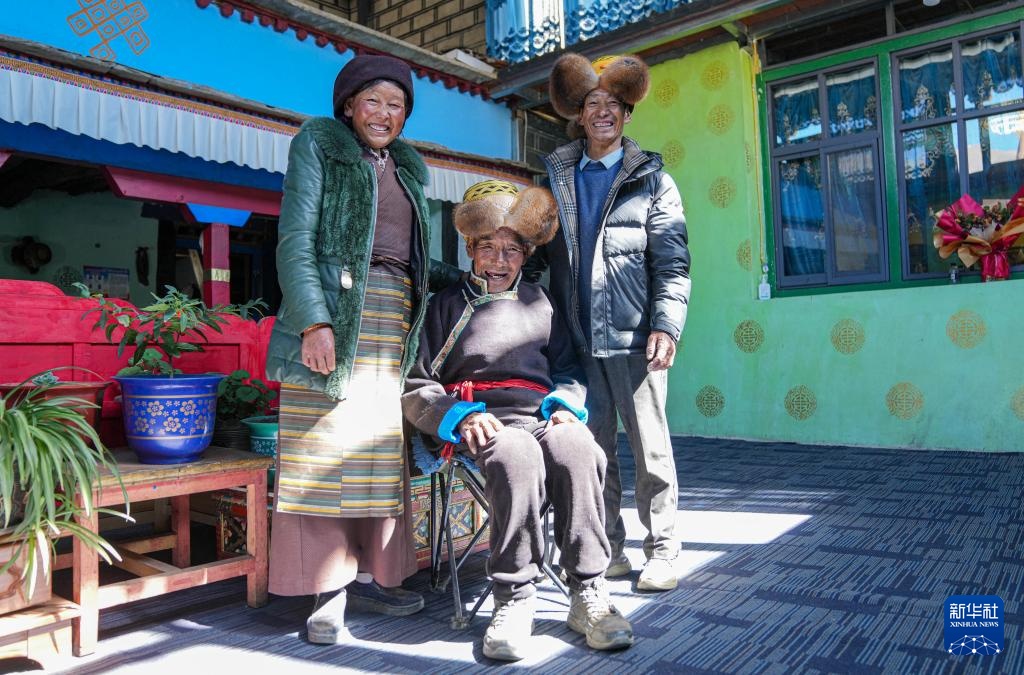 白玛扎西(中)和女儿、女婿在家中合影(3月26日摄)。