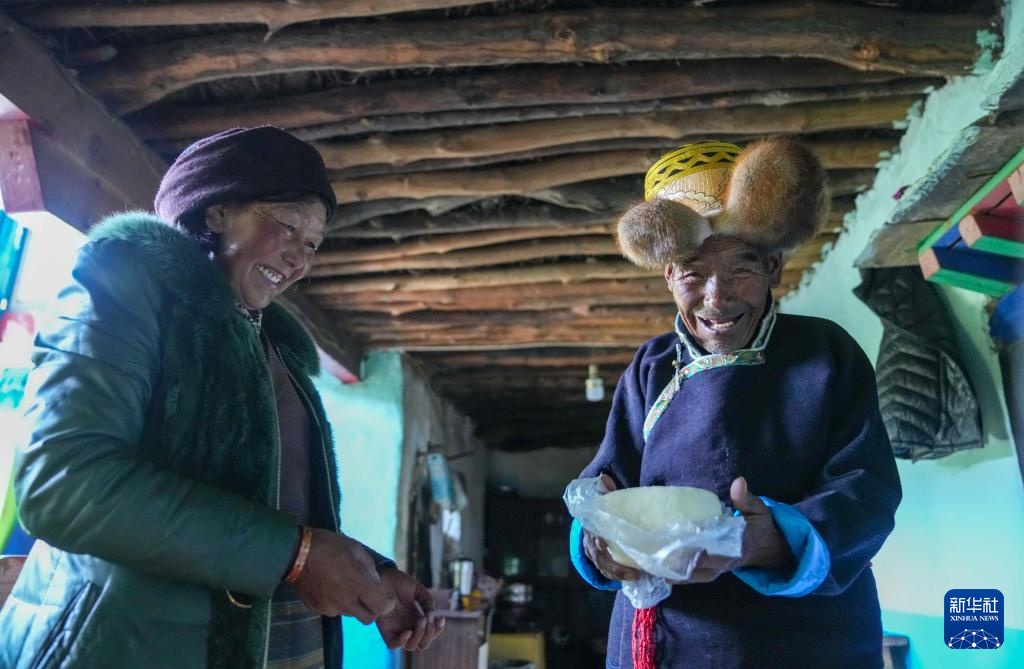 白玛扎西(右)从冰柜中取出准备做茶用的酥油(3月26日摄)。